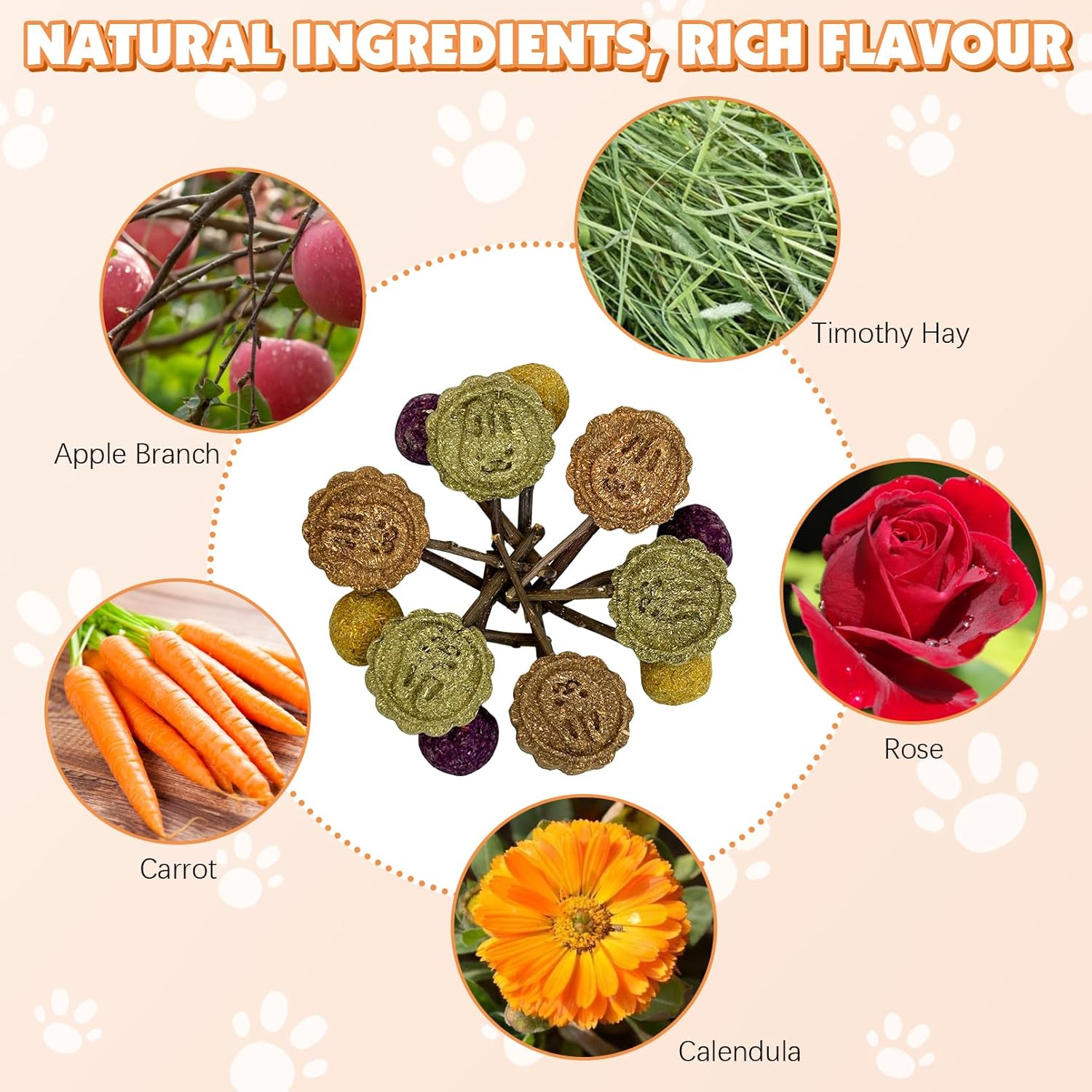 - 🐾 [Rich in Flavour]: Rabbit chew sticks package includes 3 x rose lollipops, 3 x calendula lollipops, 3 x timothy hay lollipops, 3 x bunny pattern timothy hay lollipops and 3 x bunny pattern carrot lollipops.
