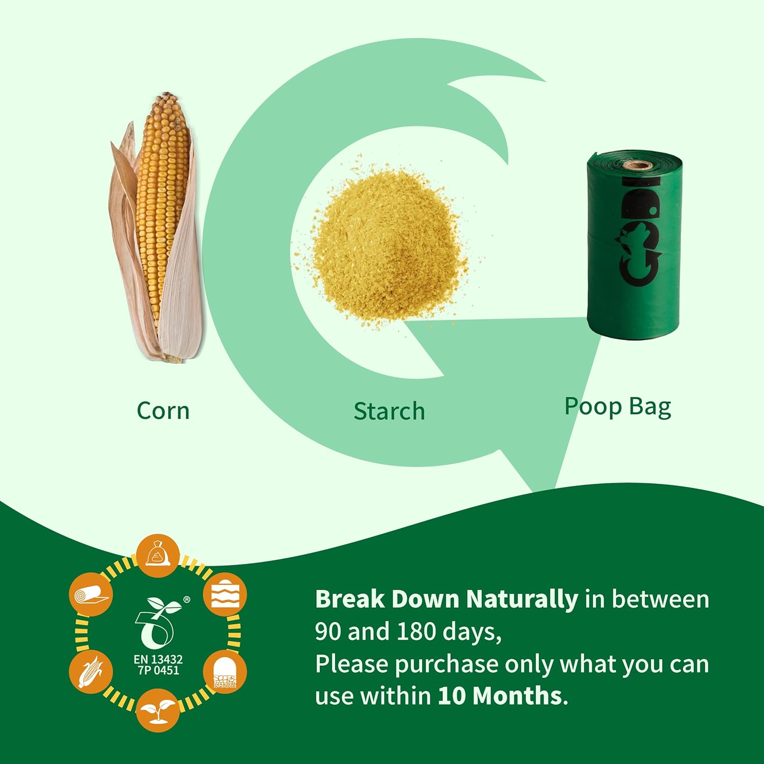 - 🌱 ECO-friendly materials: Codirom dog poop bags are made of corn, vegetable oil, and PBAT (a fully compostable polymer). Keep the bags away from heat sources and store in a cool, dry place. The available time of compostable bags is nearly 12 months, so purchase only that will be used within 10 months.