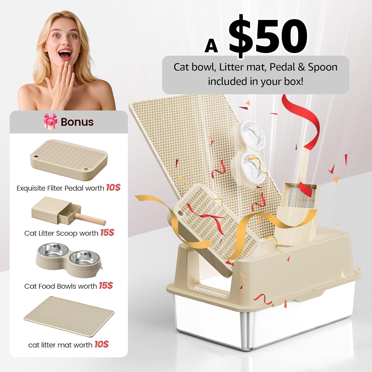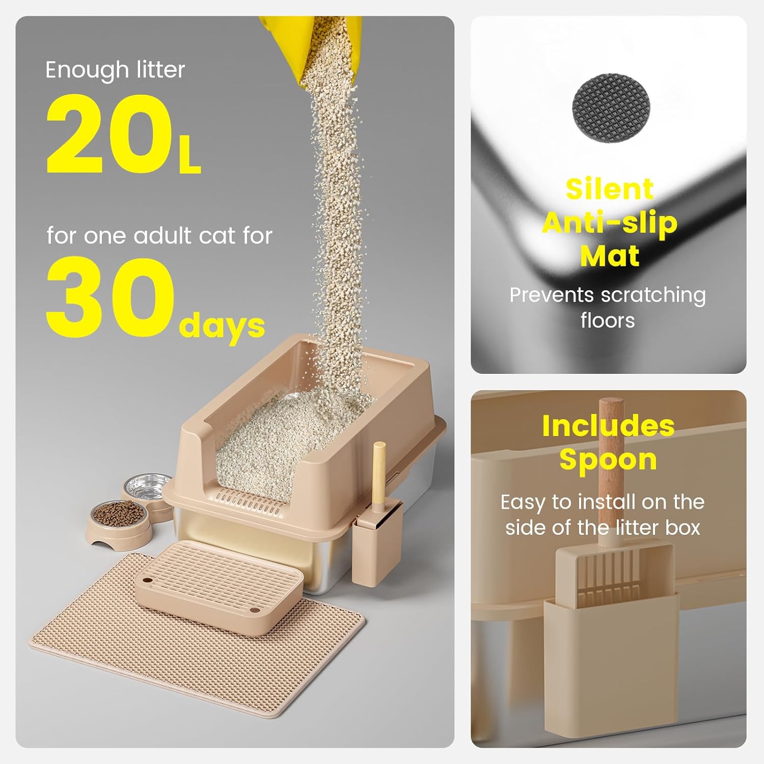 Stainless Steel Cat Litter Box - Enclosed XL Metal Kitty Litter Box with Lid for Big Cats, High Sided, Anti-Leakage, Easy Cleaning, Non-Sticky, Included Spoon & Aisle (Khaki)