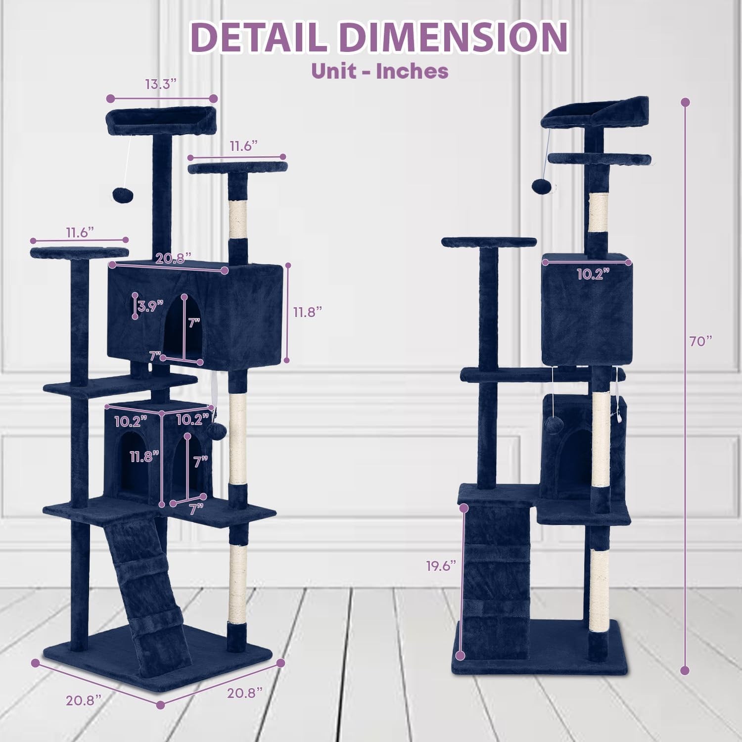 70 Inches Multi-Level Cat Tower for Indoor Cats - XL Tree Climbing Condo With Scratching Posts and Hanging Toys, Navy Blue