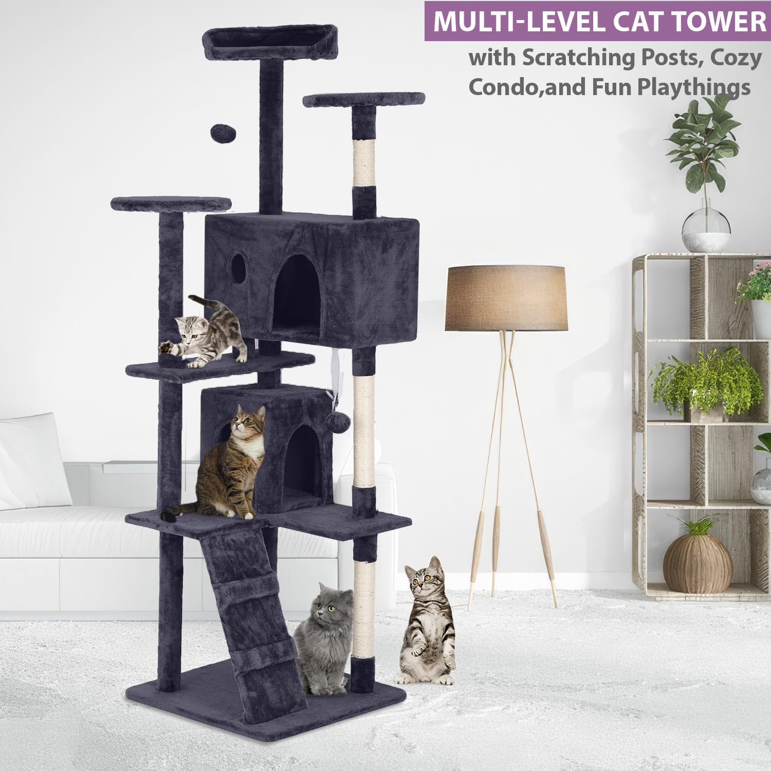 - Multi-Level Fun:This multi-level cat tree is designed for multiple kittens to play at the same time.2 spacious cat houses, sisal rope coiled posts and 3 top perching platforms for your feline friend to explore, rest or nap. The multi-tiered tower satisfies kitten's climbing desires and kittens can look out the window while sitting on top.