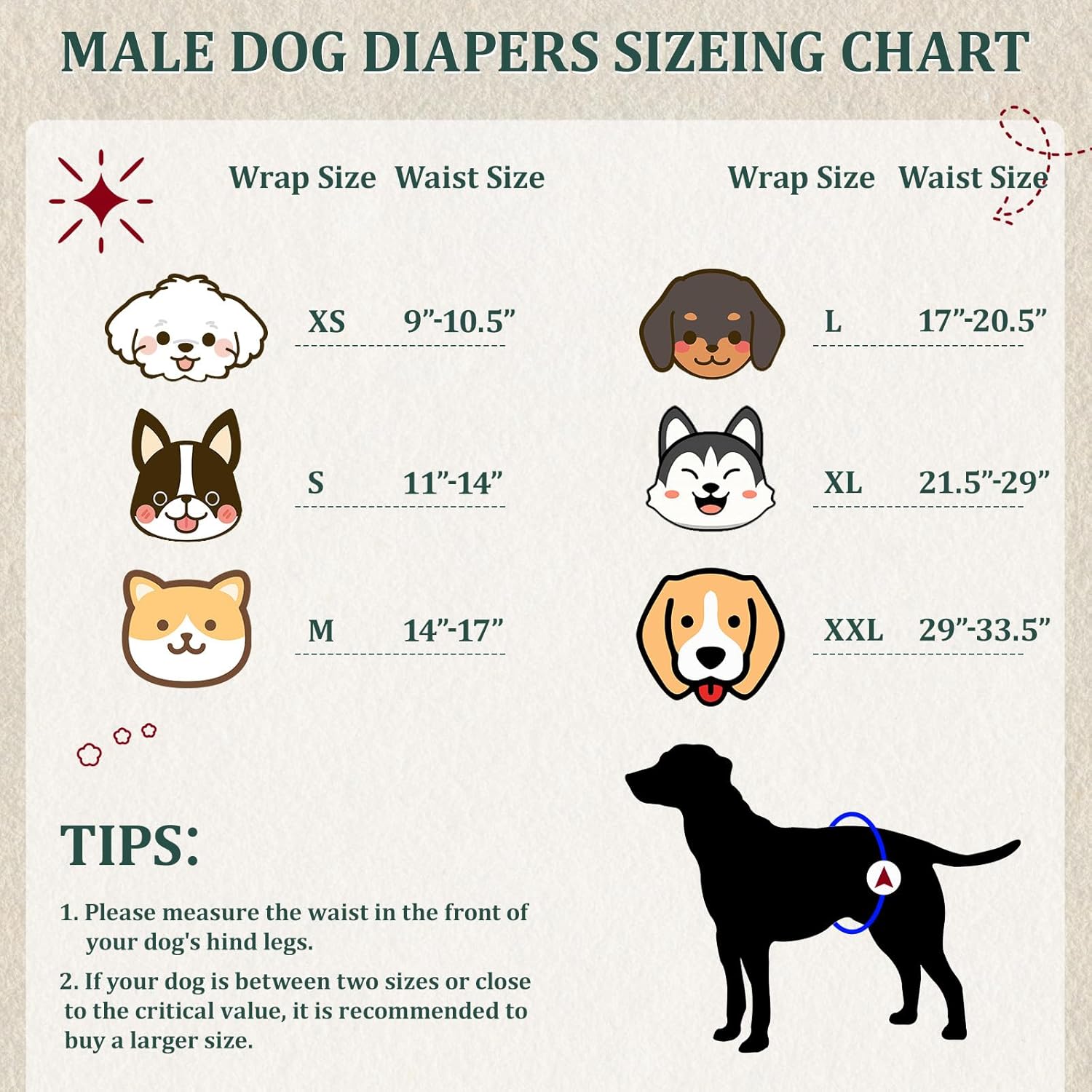 - Multi-sized and Easily Adjustable: Male dog nappies are available in 6 sizes: XS, S, M, L, XL, and XXL. Checking the size chart before placing an order is a good way to get the correct size. There are three sticking methods you can adopt depending on the size of your dog. If your dog's waist measurement is between two sizes or close to the threshold, it is recommended to buy a larger size.