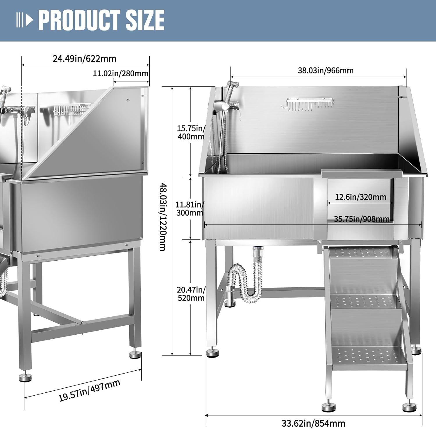 38" Pet Dog Bathing Station W/Stairs, Professional Stainless Steel Dog Grooming Tub W/Soap Box, Faucet,Rich Accessory, Dog Bathtub for Large,Medium,Small Pets, Washing Sink for Home,R-RAMP