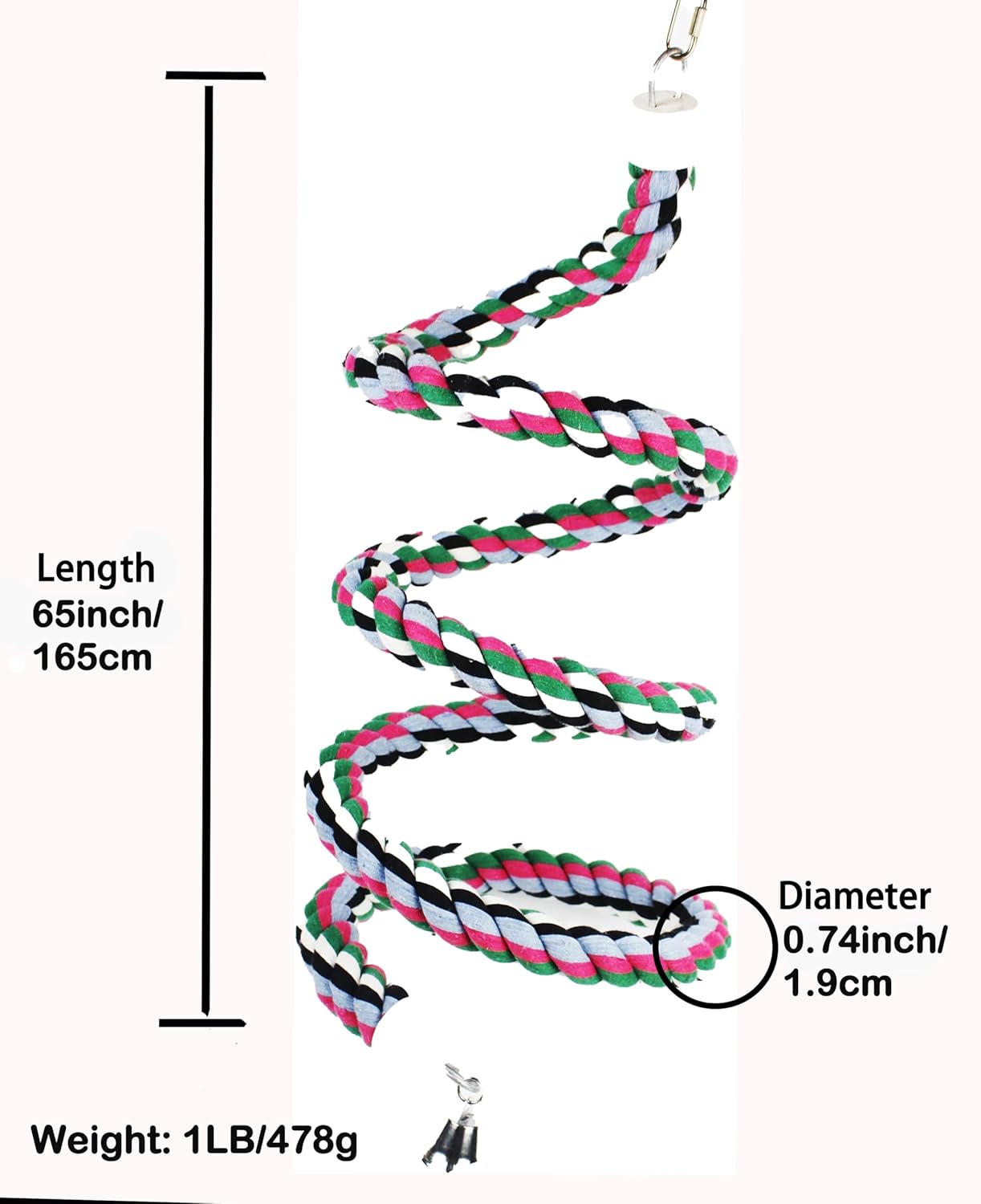 - 🐦[WHAT YOU GET] 1pc 65 inch length soft cotton rope with metal bell,fully closed/open hook can hang in birdcage or outside safety,bendable internal steel wire can re-sharp it provide more fun for your pets