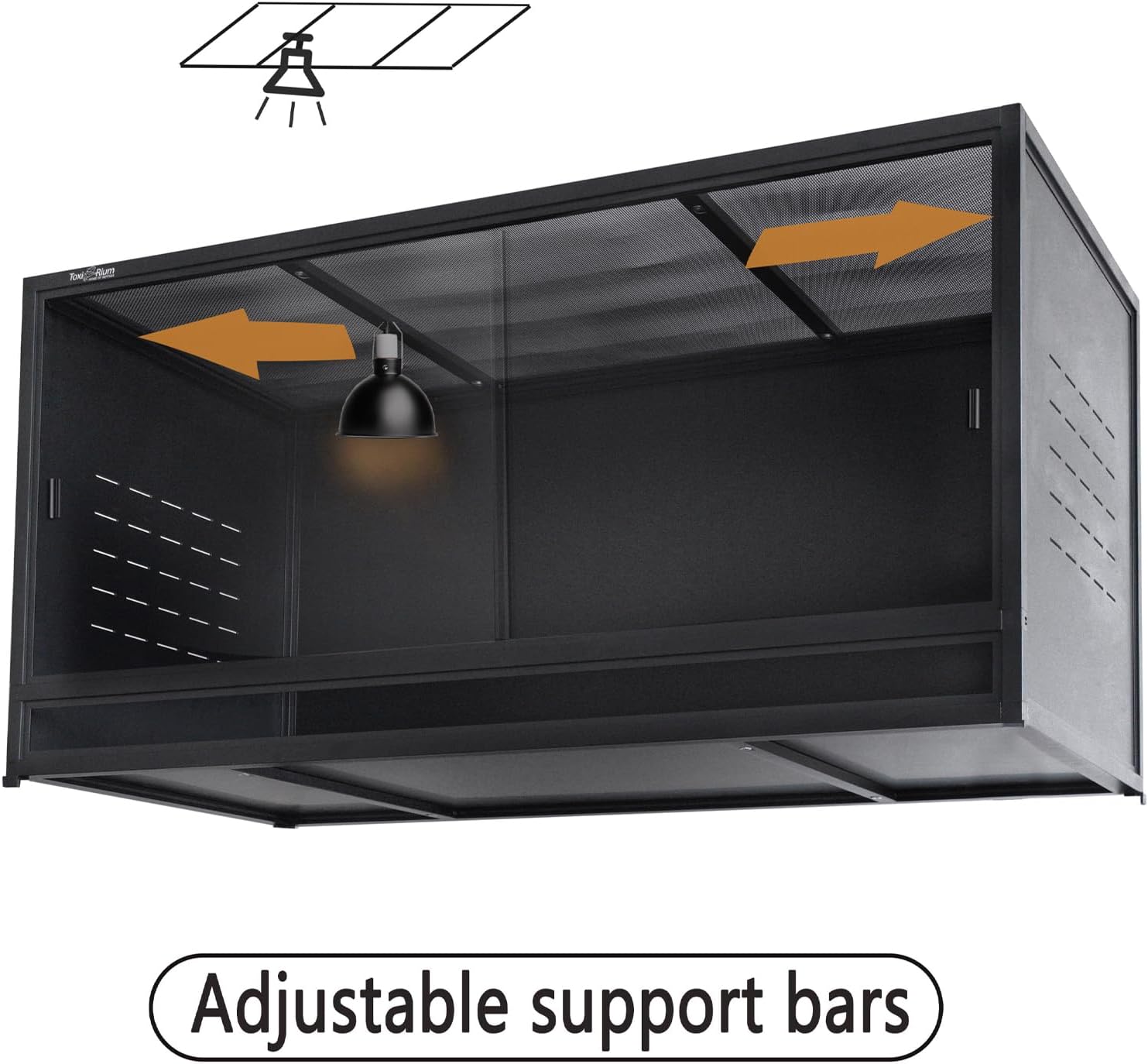- 【Heat Humidity Retention and Top Ventilation】: The side panels of ToxiRium Reptile Terrarium are made of PVC material, which helps keep heat and humidity. The top screen mesh provides great ventilation, and two crossbars can be moved in parallel, enabling you to adjust the position of the hanging heating light or UVB reptile lamp. 1 cm raised bottom to facilitate the mounting of a reptile substrate heater