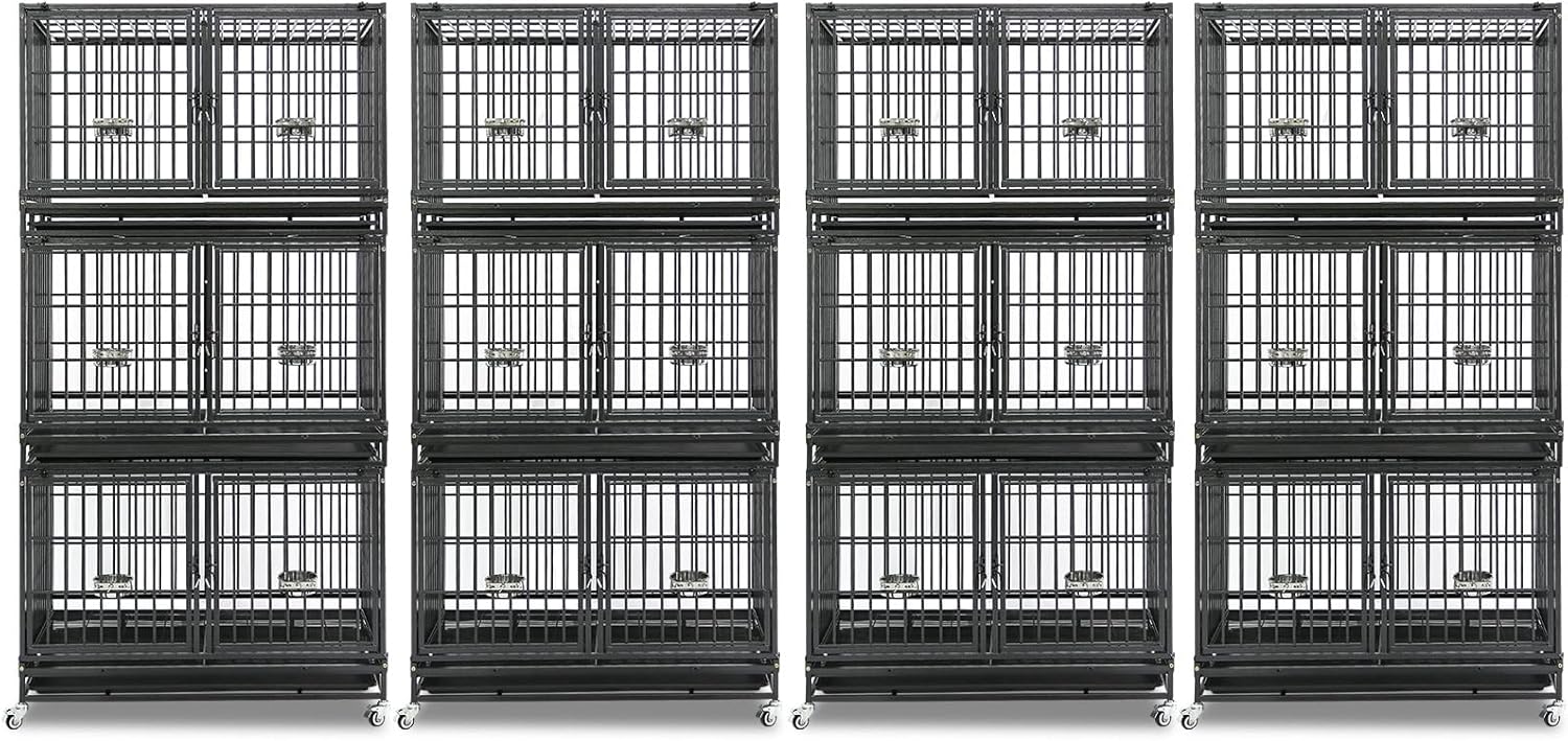 Homey Pet 4 Pack Three Tiers 43 inch Dog Crate with Wheels, Stackable Heavy Duty Indestructible Steel Dog Cage Kennel Indoor with Detachable Divider, Tray, Bowls, Escape Proof Locks