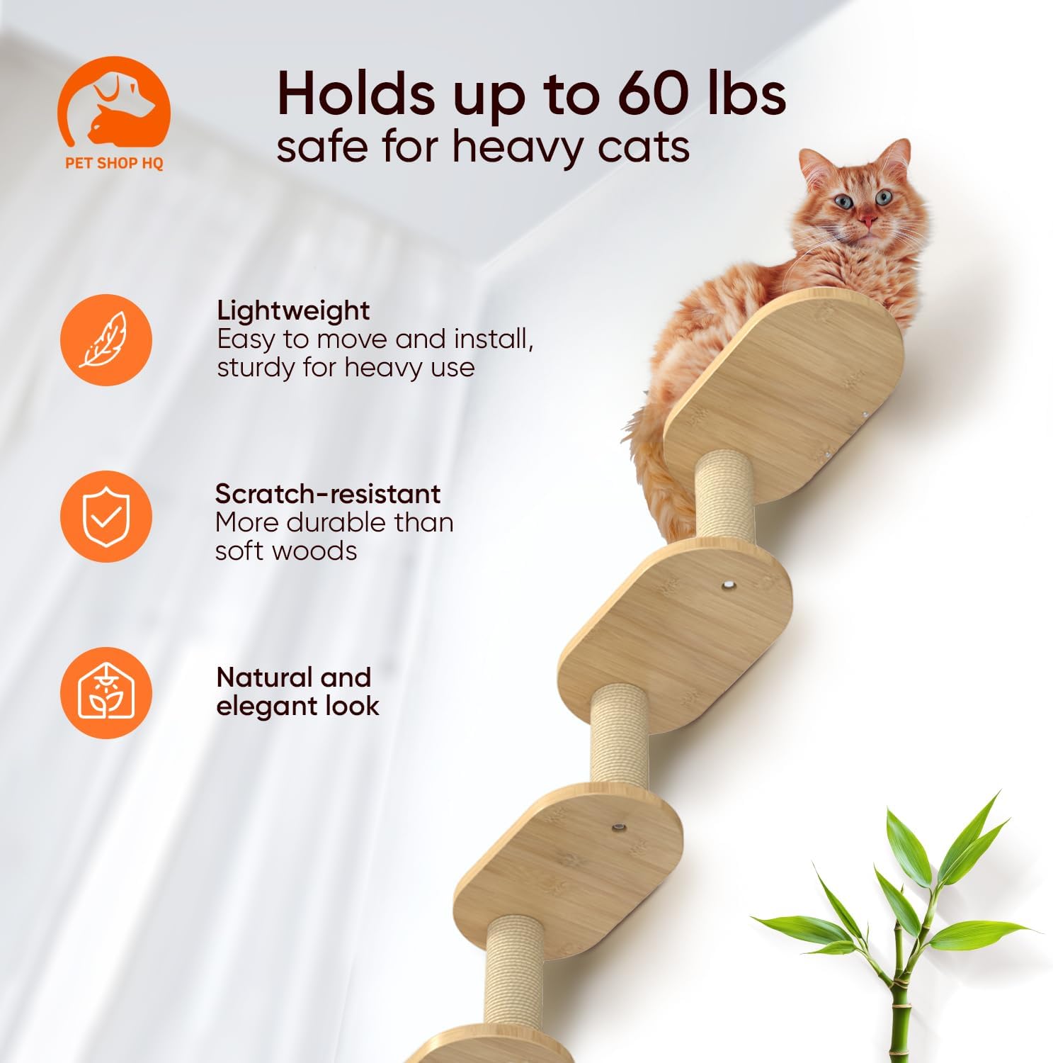 - 100% Bamboo Wood: Our cat shelves for wall are made from 100% bamboo, with no varnish or formaldehyde, ensuring a safe and eco-friendly option for your cat’s well-being. The wood is odorless, stylish, and durable enough to last long