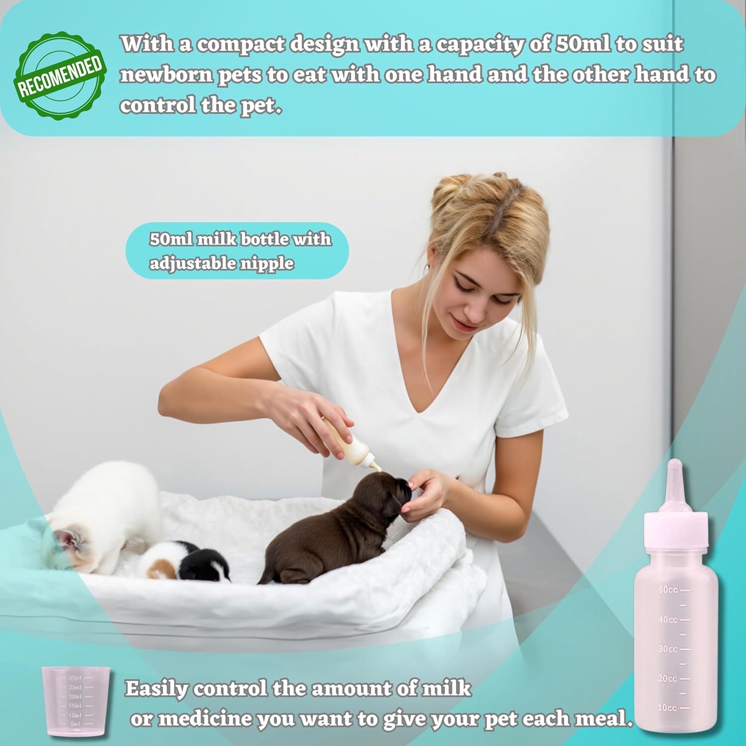 Newborn & Senior Pet Feeding Kit, Kitten/Puppy Bottle (50ml), Syringe with Silicone Nipple, Oral Dosing Syringe, Soft BPA-Free Nipples, Medicine Dispenser & Travel Case for Cats Dogs Rabbits Squirrels