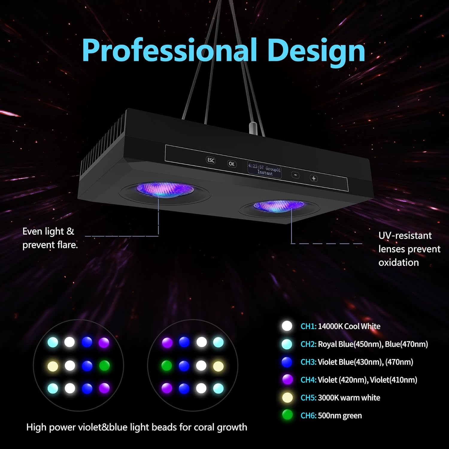 - BETTER HEAT DISSIPATION & NO NOISE -Smart two-rollers silent temperature control fans ensuring optimal LEDs' working conditions. Noise standards is lower than 44.7 db(A), fast heat transfer and create you a comfortable environment. G5 is very good coral lights for saltwater tanks