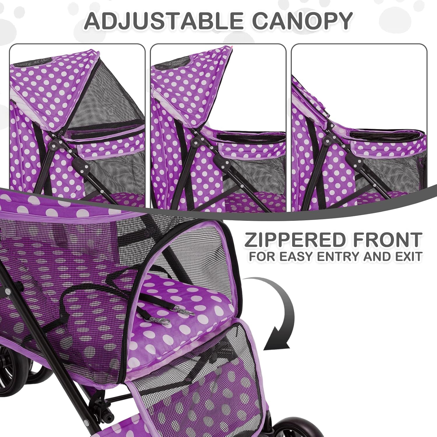 MoNiBloom 4 Wheels Pet Stroller, Easy-Fold Umbrella Shaped Dog Cat Jogger Stroller w/Storage Bag & Visible Mesh for Small/Medium Dogs Cats Purple Polka Dots