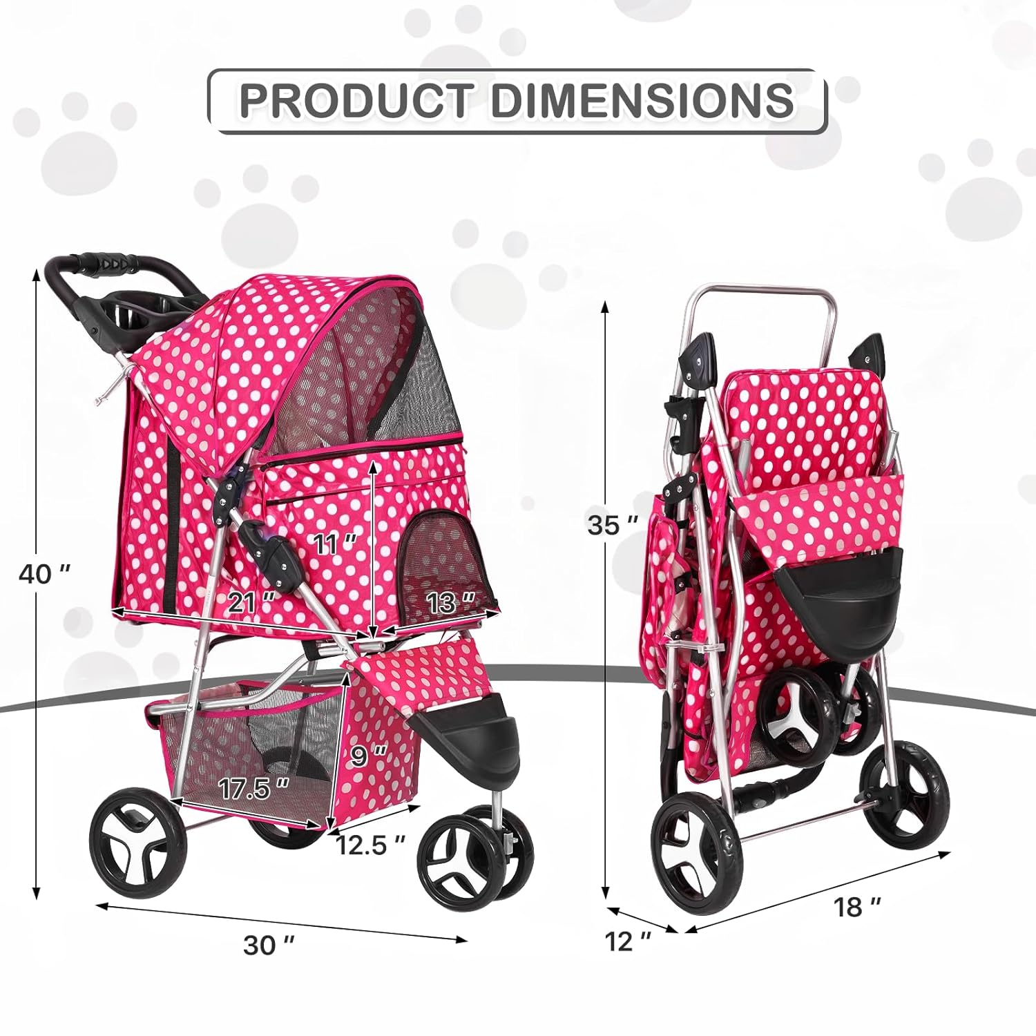 MoNiBloom 3 Wheels Pet Dog Cat Stroller for Small Medium Dogs Cats, Foldable Jogger Stroller w/Storage Basket and Cup Holder, Hot Pink Polka Dots