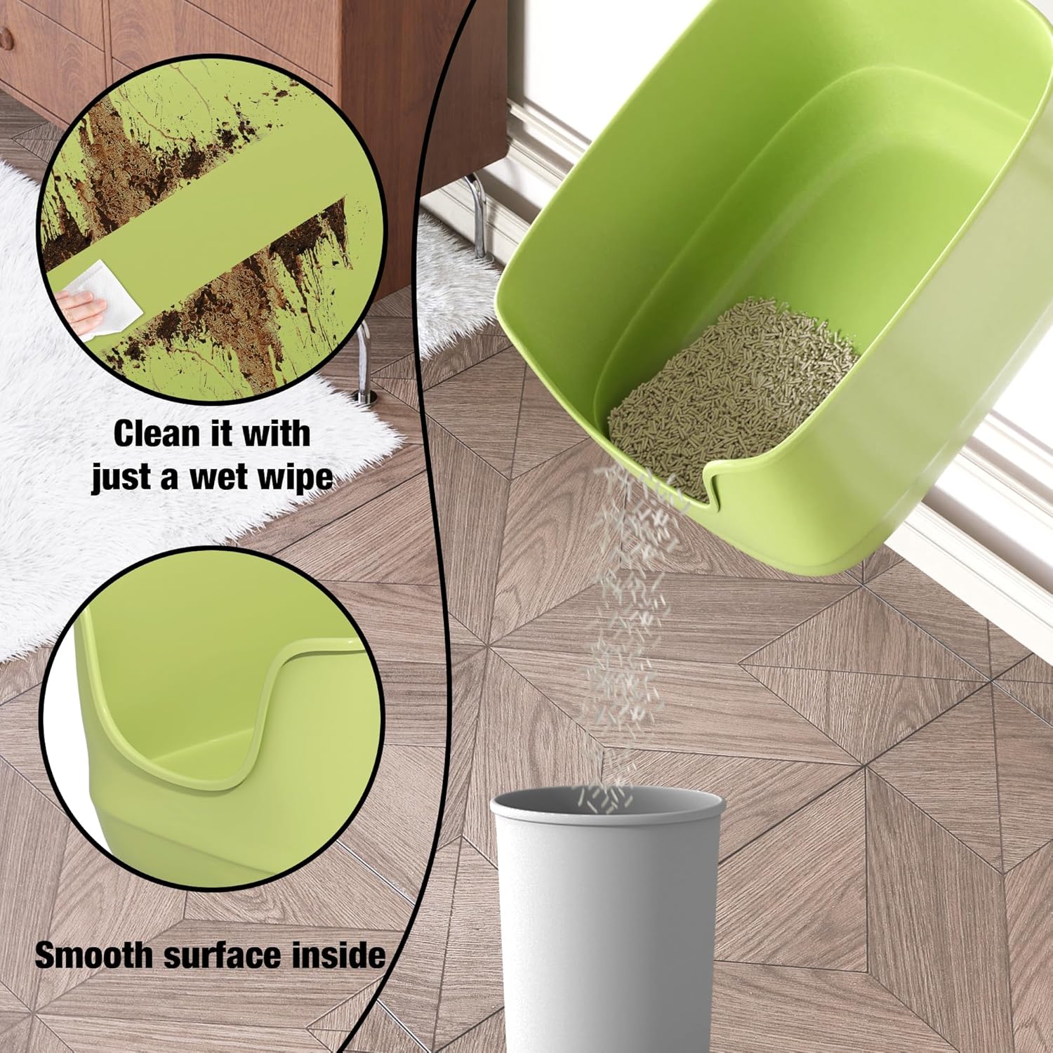 - No Gaps: One-piece molded construction requires no assembly, simple and no gaps, cat litter won't leakage or get stuck in the crevices, say goodbye to annoying cleaning problems,making cleaning easier.