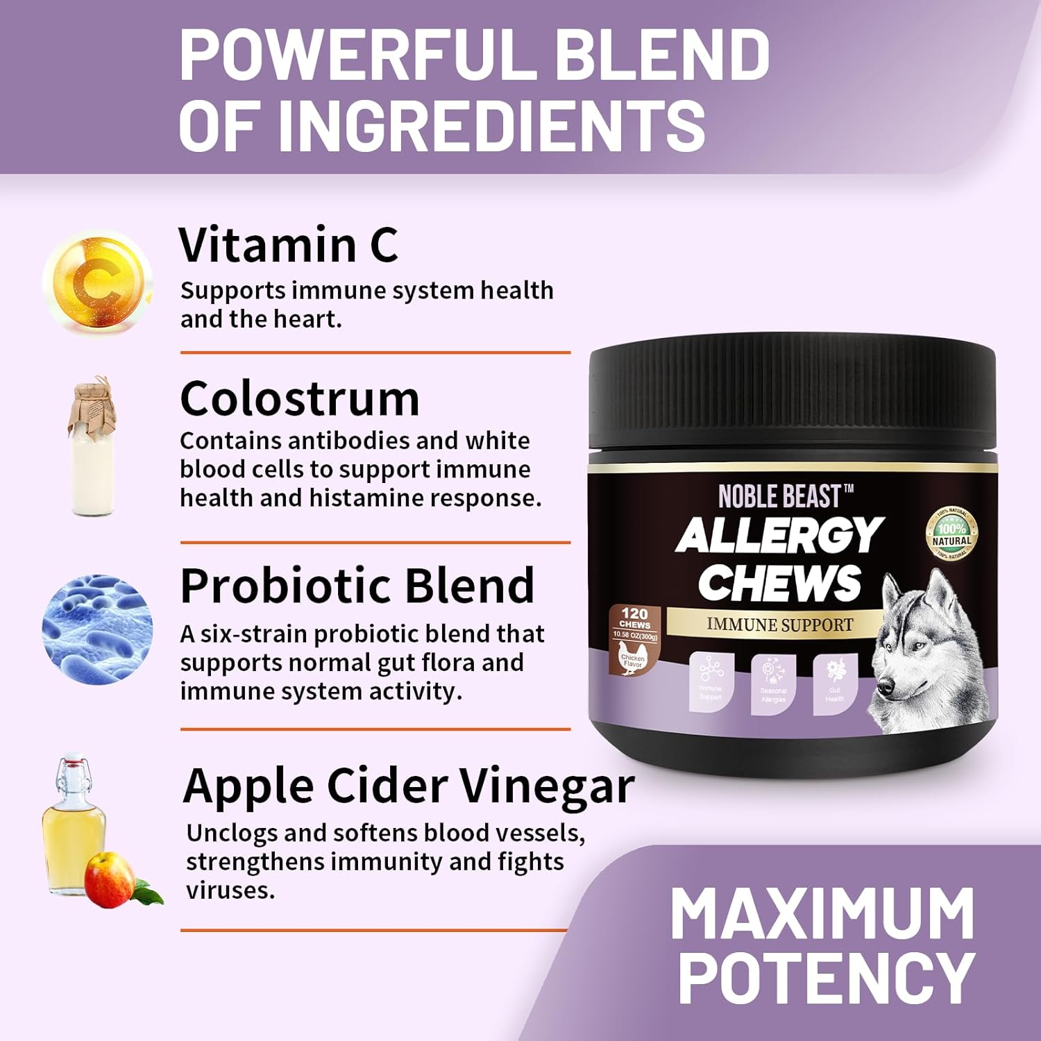 Noble Beast Dog Immune & Allergy Supplement - Itch Relief - Probiotics for Dogs - Skin & Seasonal Allergies - All Natural - Soft Chews with Hemp and Colostrum - Chicken Flavor - 120 Count