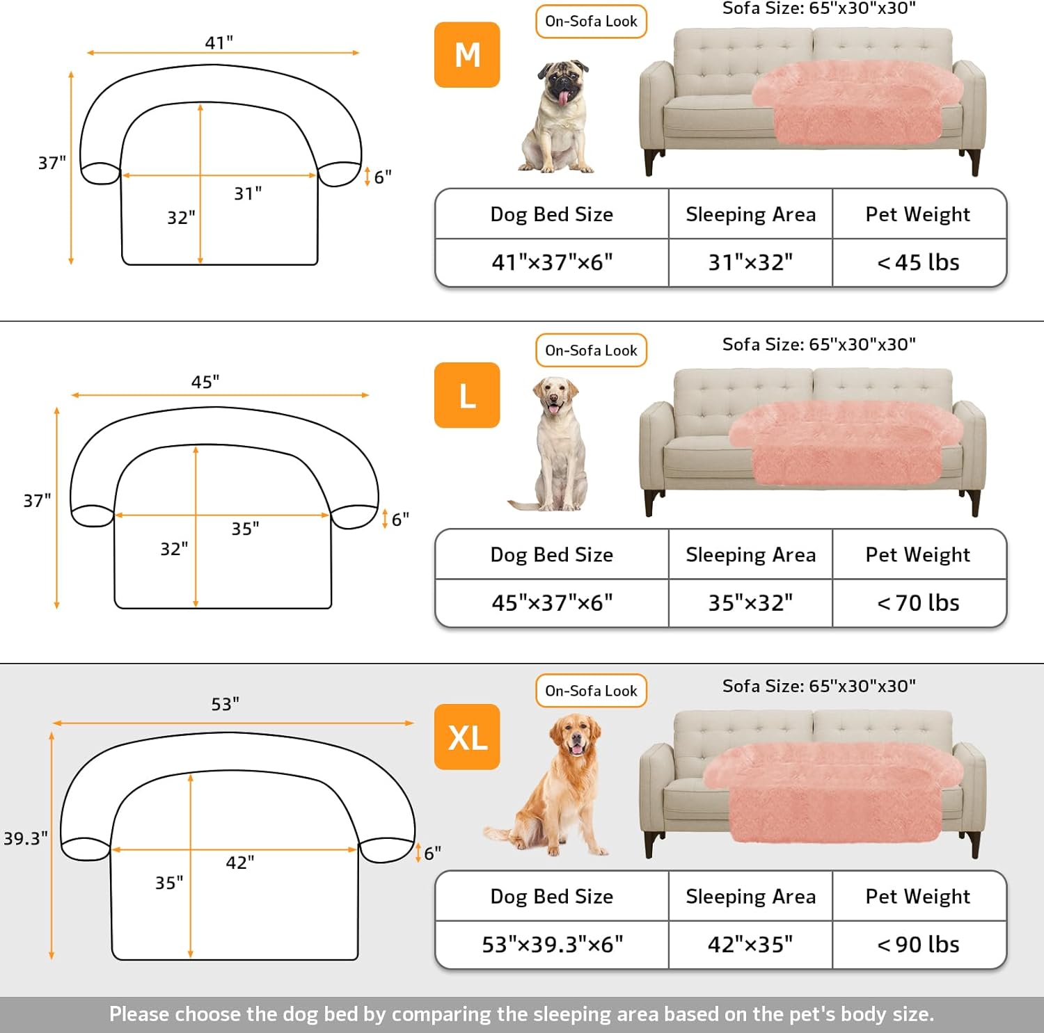 - 【Multiple Size Selection】The couch pet bed has 5 sizes for you to choose from. XS: 31"x23.5" dog bed for small pets. S: 35“x31" dog bed for cats and small dogs. M: 41”x37" dog bed for medium dogs. L: 45“x37" dog bed for large dogs. XL:53"x39" dog bed for large dogs. We have enlarged the sleeping area for pets to give dogs more space.