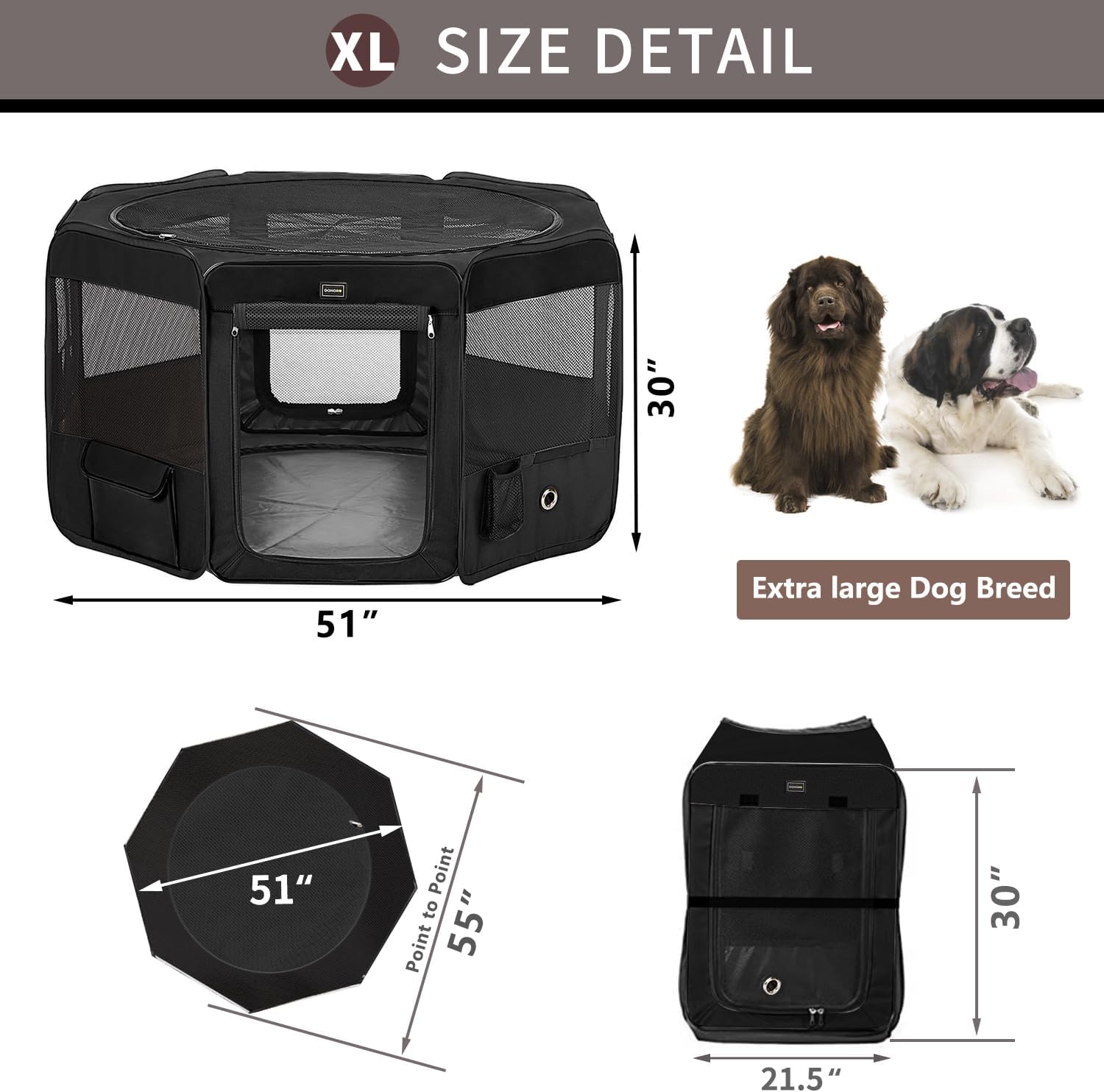 DONORO Dog Playpen Portable Pet Play Pens for Small Dog/Cat/Rabbit/Chicks, Cat Playpen Indoor/Outdoor with Carring Case, Removable Zipper Top and Bottom (Black, Extra Large (55"x55"x30"), 8)