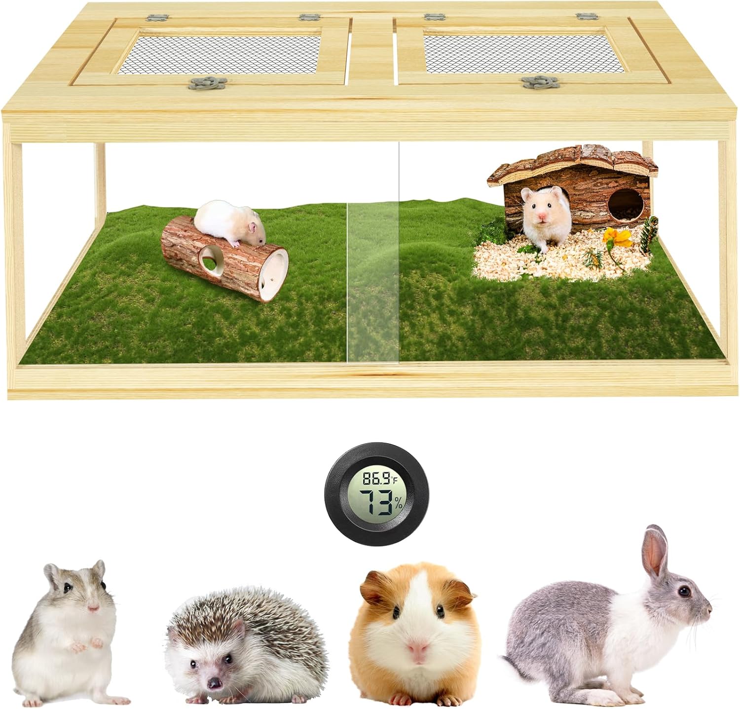 - Efficient ventilation: The dwarf hamster cage ensures efficient airflow and ventilation. Equipped with an openable metal mesh top cover and sliding door, it effectively promotes air circulation. Additionally, it includes a hygrometer to monitor humidity and temperature, providing ideal living conditions