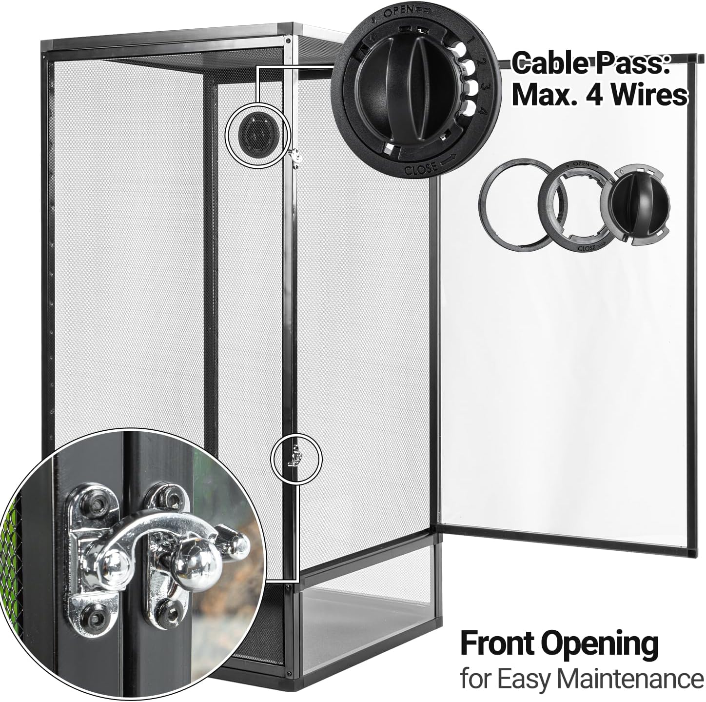 - Front Opening & Optical Holes: The door of this Cage is equipped with a lock and can be opened completely, offering unmatched convenience for daily cleaning and feeding. The side cable outlet holes ensure tidy cable management. and come with background sticker and a removable PVC tray, you can install and use it according to reptile's needs