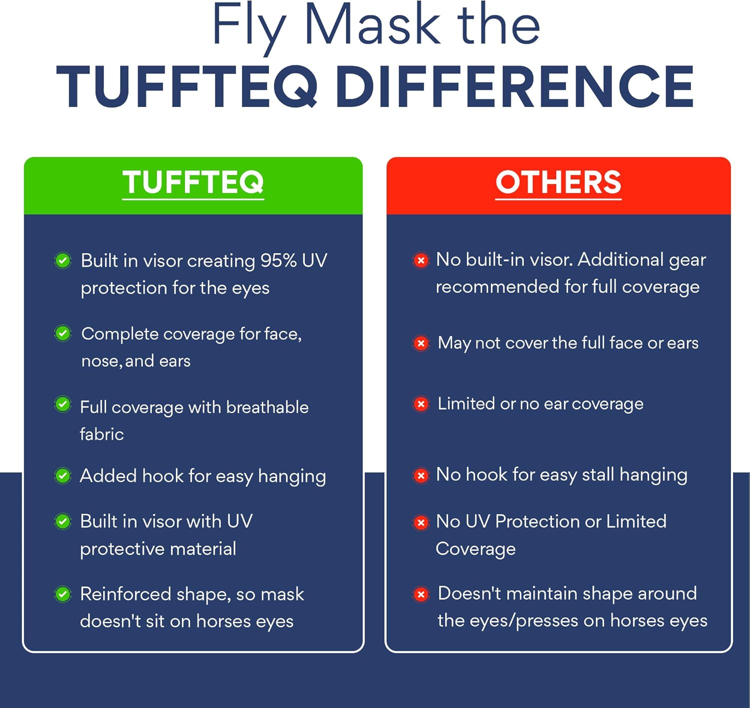 - ๐๐ง๐ก๐๐ง๐๐๐ ๐๐ ๐๐ซ๐จ๐ญ๐๐๐ญ๐ข๐จ๐ง & ๐๐จ๐ฆ๐๐จ๐ซ๐ญ: Featuring a built-in visor with UV-blocking material, this fly mask provides excellent protection from harmful sunlight and glare, while ensuring your horseโs visibility is not compromised. The design offers full coverage for the face, nose, and ears, keeping your horse comfortable and reducing eye strain, even under intense sunlight. With this mask, your horse stays protected and alert, no matter how bright the day.
