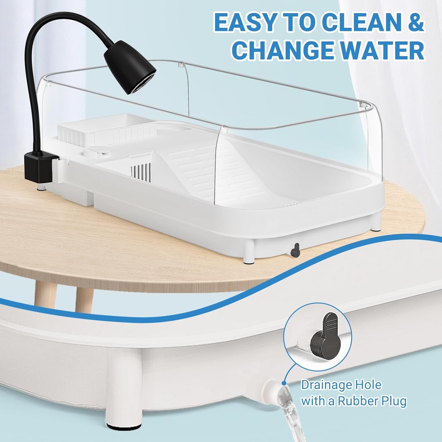- 【Easy to Install & Clean】Included manual, our aquatic turtle tank kit is very easy to install, just insert the 4 panels on the base. Bottom drainage outlet is equipped to help you change water in no time. A cleaning brush helps you clean turtle tank more efficiently.