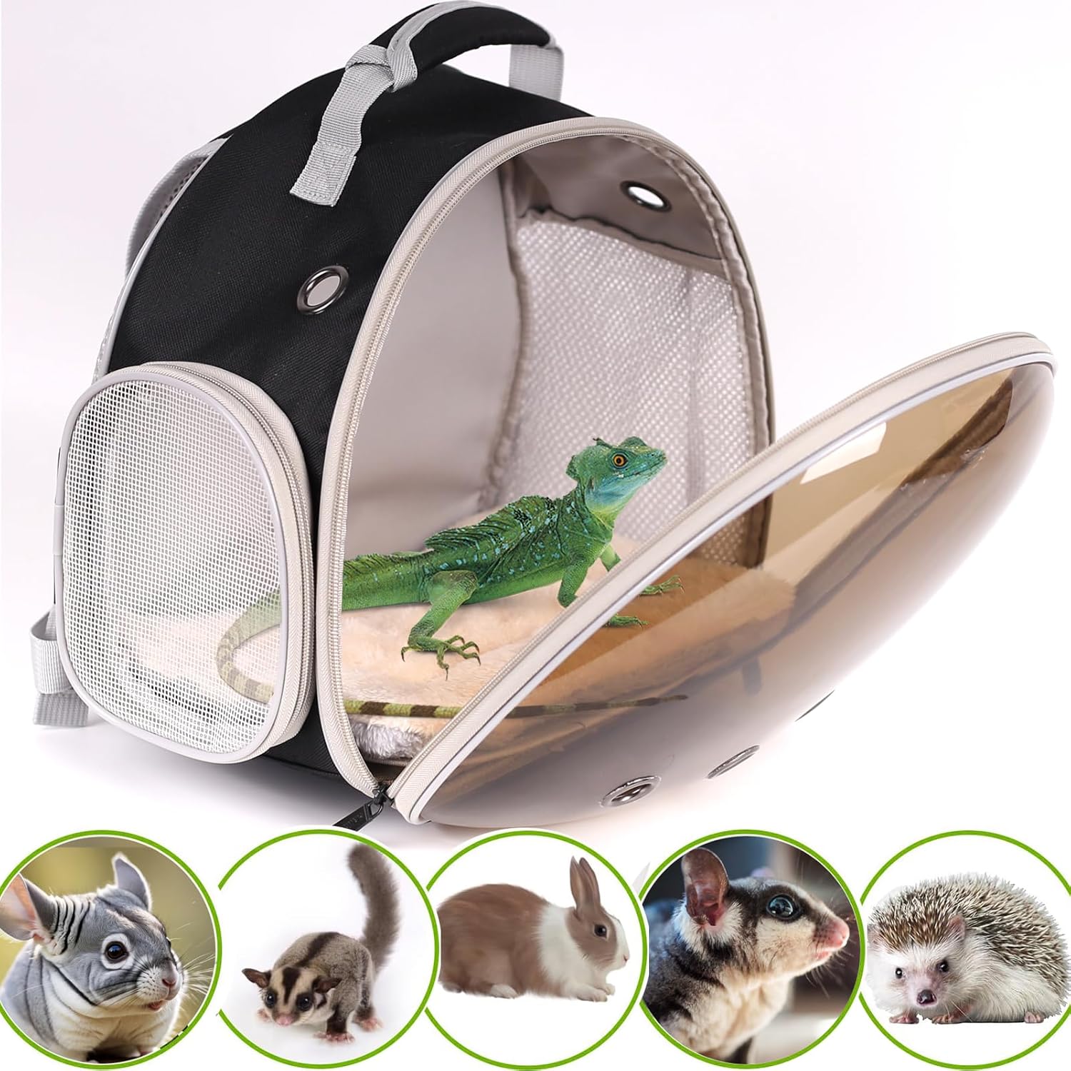 - 2024Upgraded Bearded Dragon Carrier with a big polarized bubble Window to protect your pet's eyes from strong light burns,The front hard clear bubble window is better to protect reptile from crushing and attacking if accidents, it also provides a nice front view so they could check surroundings without anxiety.