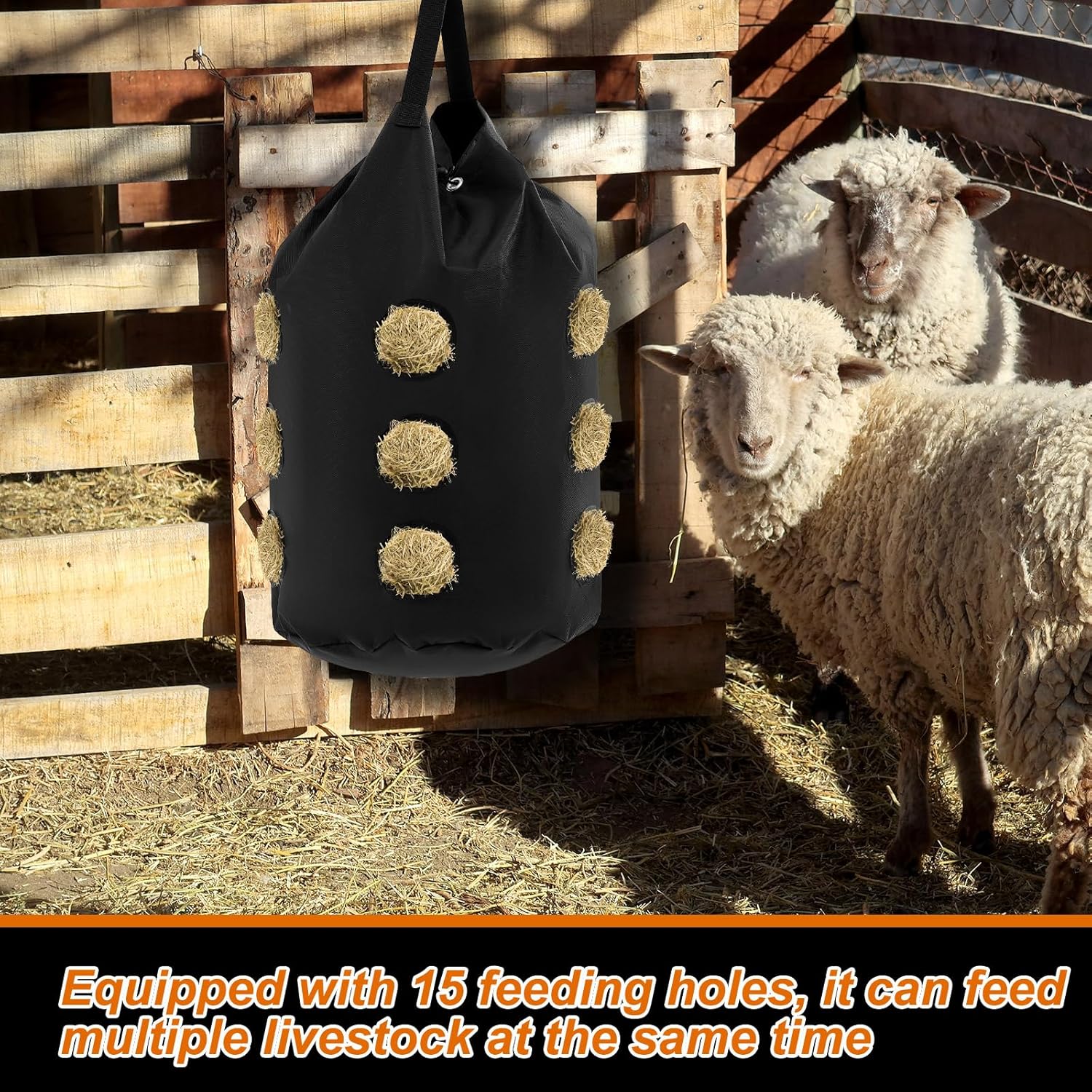 - Exceptional Material for Ideal Performance: the round hanging hay bags are ingeniously crafted from oxford 1680D fabric ensuring robustness and longevity; It is resistant to being chewed up by livestock due to its double layer reinforced sewing around the feeding hole; This black material, measuring approximately 27.95 x 15.94 inches, was thoughtfully chosen to withstand regular usage while still maintaining its form and functionality