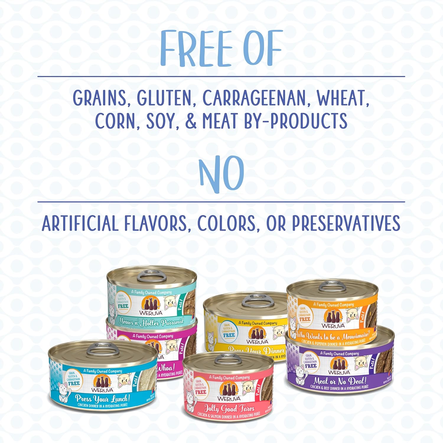 - Weruva Wet Cat Food, Grand Prize Patés Variety Pack 5.5oz, Pack of 12 includes three (3) of each: Meal or No Deal, Tic Tac Whoa, Jolly Good Fares, Meows n' Holler Purramid