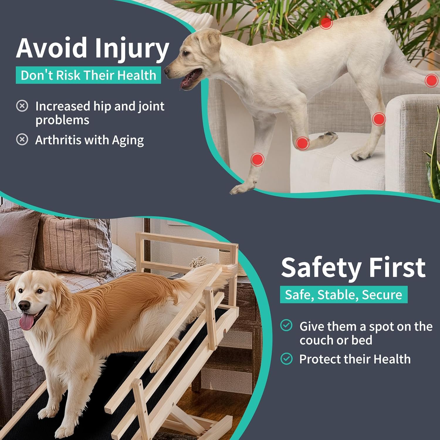 - STURDY & DURABLE: Our pet ramp for dogs and cats is specially made very well - solid wood construction and sturdy stainless steel fasteners, which has been tested to support up to 200lbs. When they jump off the bed, sofa, and sofa, there is no need to worry about getting injured, which provides safety for your pet.