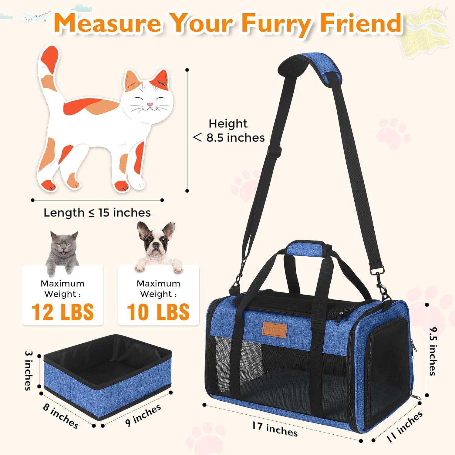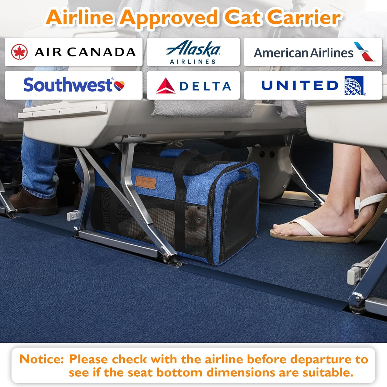 - 【TSA-Approved Pet Carrier in Cabin】 It is mainly designed for Alaska Airlines: 17x11x9.5", but also in compliance with Southwest Airlines: 18.5x13.5x9.5"; Delta Airlines: 18x11x11"; United Airlines: 18x11x11"; American airlines: 18x11x11"; Air Canada: 21.5x15.5x10.5"; So we recommend you buy this carrier when you fly with the airlines mentioned above