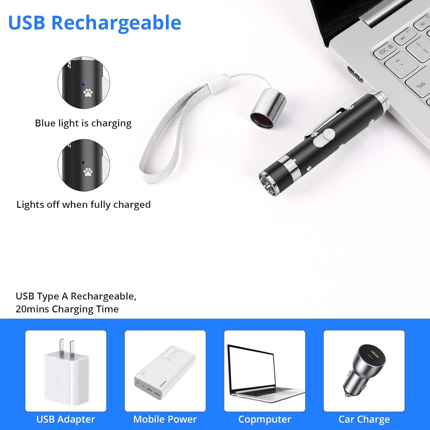 - 【Versatile Functionality】This cat light toy is more than just a pet accessory. It doubles as a presentation pointer with a bright beam for clear visibility. Easily activate it with a single push—no need to hold the button continuously. It also features a glow-in-the-dark light mode and a purple mode for detecting counterfeit money.