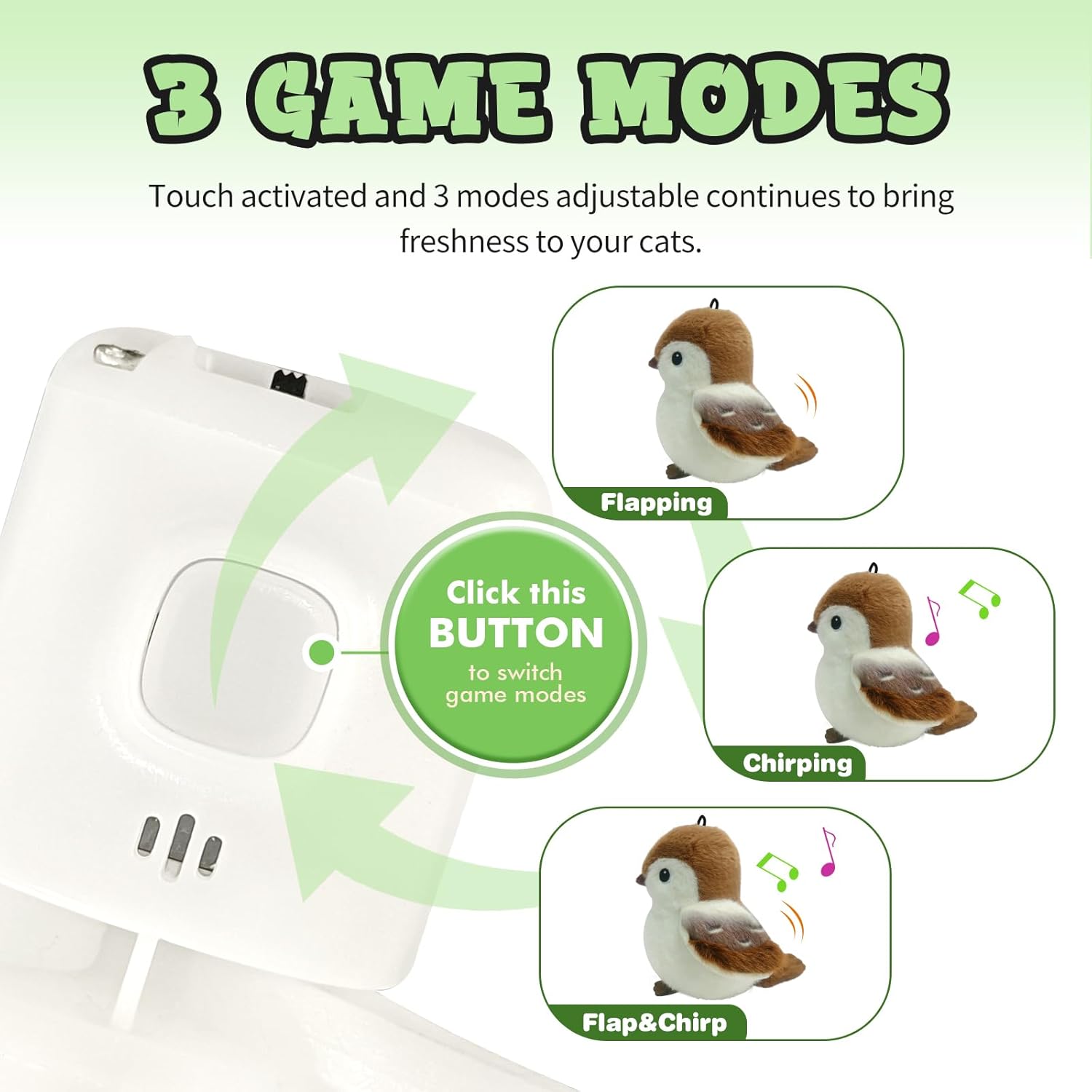 - Interactive Cat Toys:Whenever your kitten touches or slaps this cat toy, the built-in automatic motion sensor will be activated, and the cute sparrow will flapping its wings and chirping, thus attracting your cat to interact and play with it