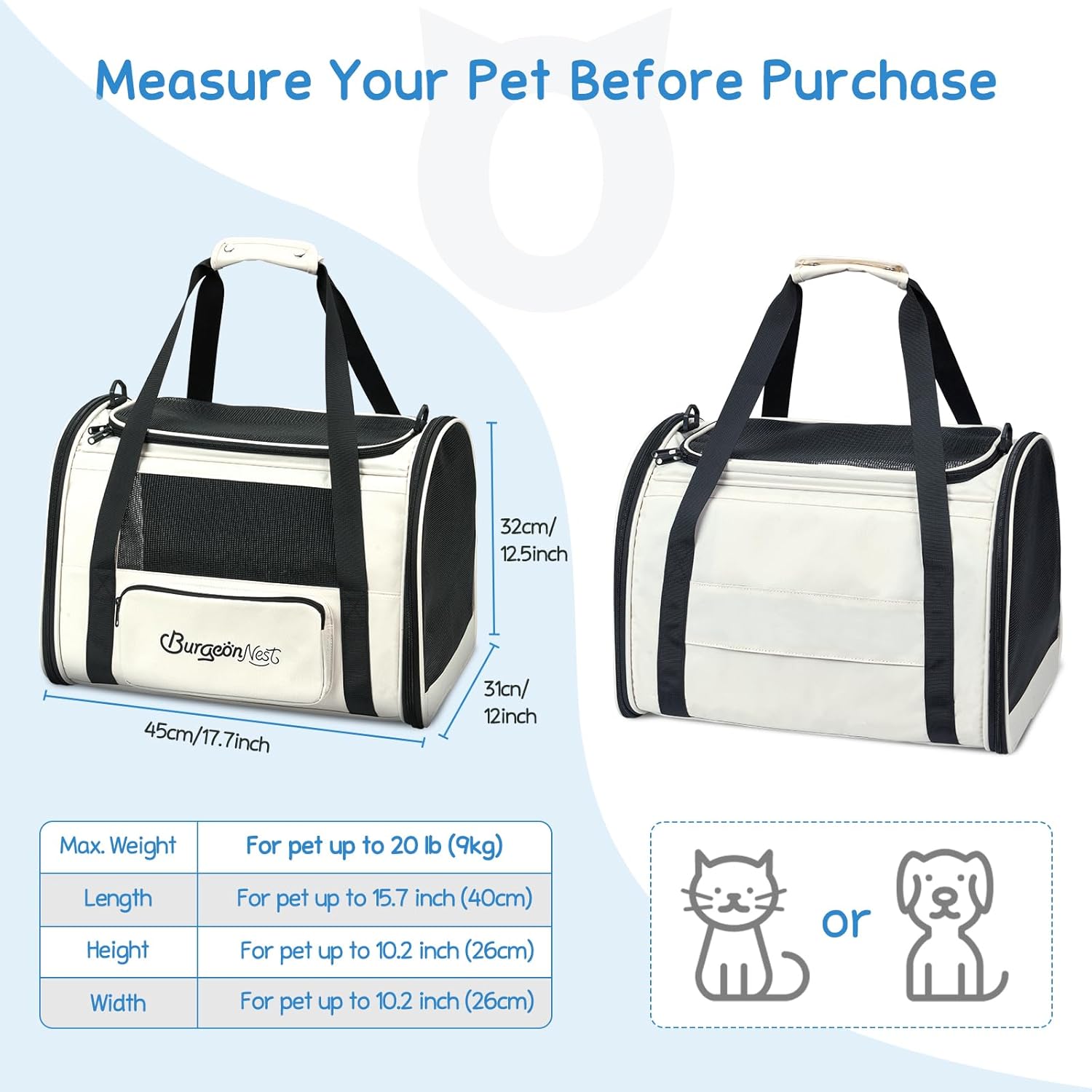 - Soft Cat Carrier: BurgeonNest Pet carrier measures 17.7"L x 12"W x 12.5"H, weights 2.5 lbs perfect for pets under 20 lbs; ideal for travel/ vacation/ leisure/ hiking/ car/ outdoor activities etc.