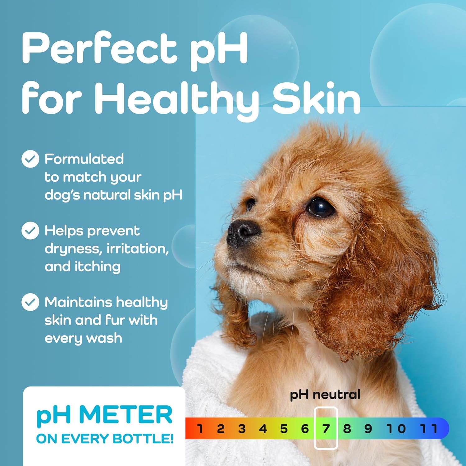 - pH-Balanced for Skin Health – Featuring a built-in pH meter right on the bottle, this shampoo for dogs ensures every wash is balanced for skin wellness. Proper pH supports the natural skin barrier and makes this a trusted choice for itchy dog shampoo needs and long-term coat care.