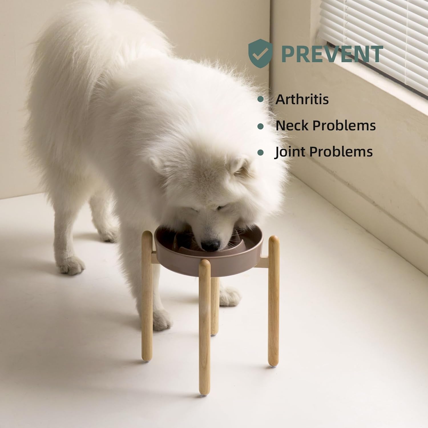 9.5inch Ceramic Raised Slow Feeder Dog Bowl Set, Elevated Bowl with Wooden Stand for Large Dog, Puzzle Slow Pet Food Dish, Preventing Choking(Brown Coffee, Single Bowl+ Stand)