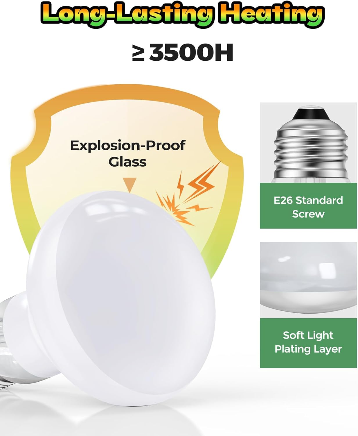 - Premium Reptile Heat Lamp: Our basking light is crafted from high-quality glass and filament materials, ensuring safe and reliable use. Designed for durability, this heat lamp delivers consistent performance with a lifespan of up to 3,500 hours. Plus, each reptile light bulb undergoes rigorous inspections and safety certifications, guaranteeing top-notch quality and safety