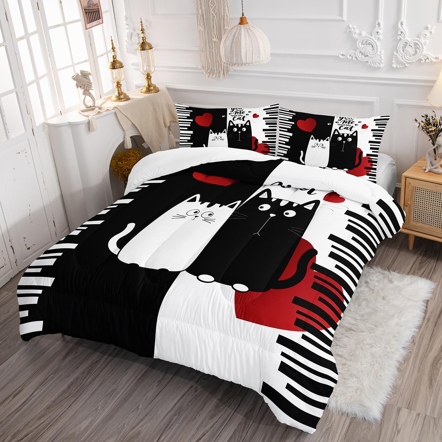 - Cute cat design: This cat comforter adopts the latest 3D printing technology and a unique design style. Two cartoon cats, one black and one white, one big and one small, were used, paired with a red heart-shaped pattern and unique lines. Very suitable for children, women, and companions who love pets. It can make your room lively and interesting. Make your bedding look lively and cute.