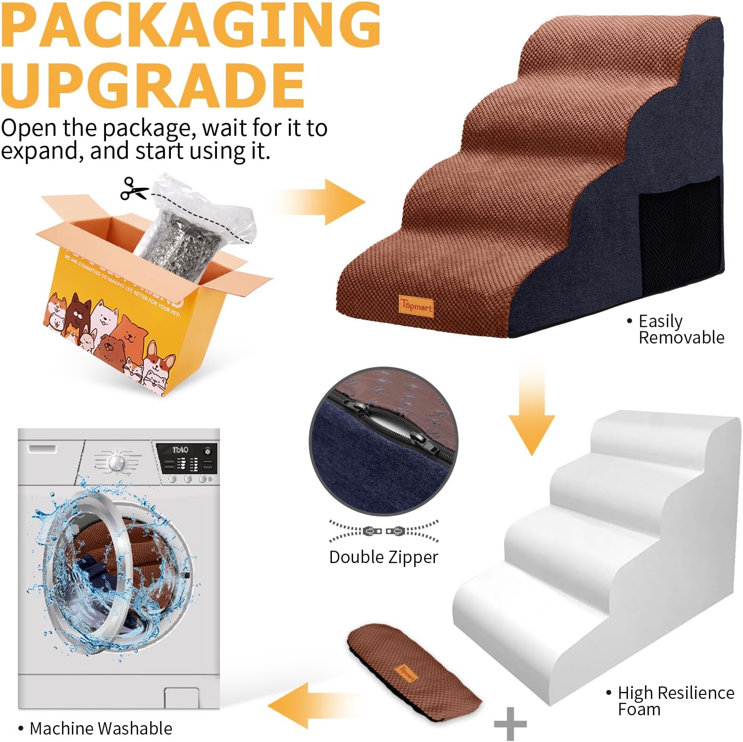 - Safer,Wider&Deeper Steps:Each step is 15.75in x 7.1in.Our dog stairs are excellent for those older dogs who are less mobile as they age or for cats with injuries. More wide and deep steps are helpful for reducing the strain that constantly jumping up and down onto bed,sofa or car can have on your pet's joints,and Topmart dog steps will not shake and slip during use. The cover made of corduroy is more frictional than other covers, pets will not slip on the stairs.