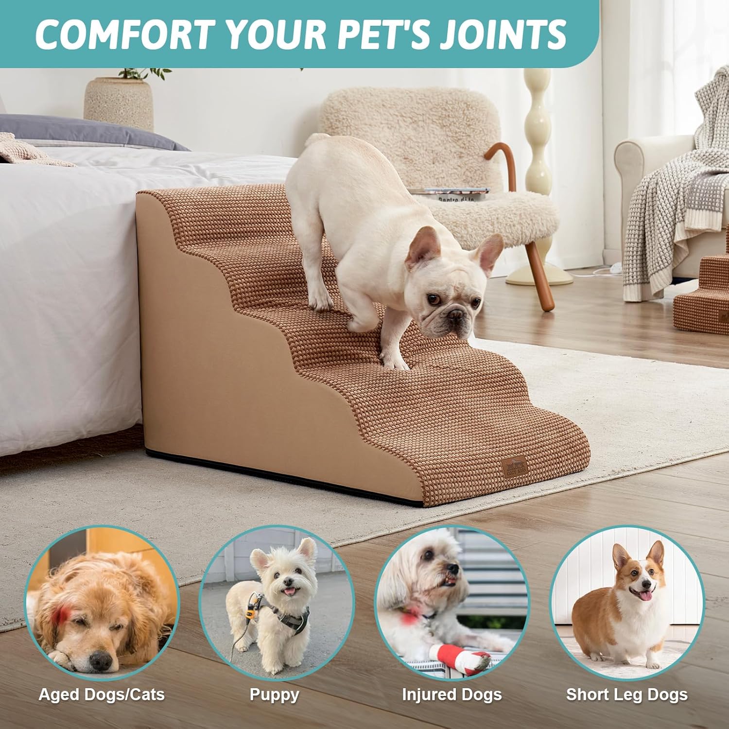 - HIGH DENSITY SPONGE: stairs for dogs to get on the bed adopt 30D high-density pure sponge, which provides better support while providing a soft return contact surface, reducing the pressure on the joints when pets repeatedly jump on high bed, sofa, couch and car. The stairs are covered with high-quality corduroy to provide additional stability