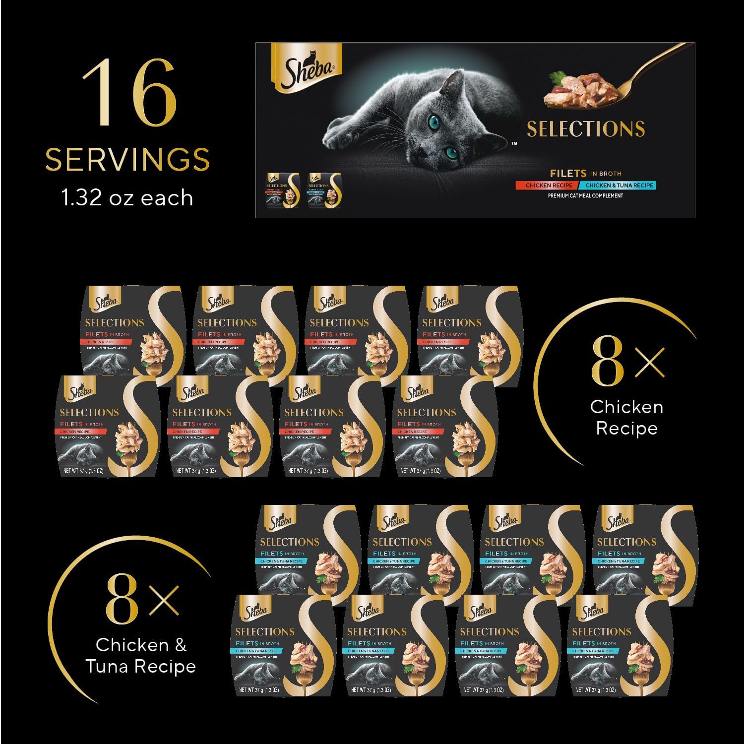 Sheba Selections Filets in Broth Adult Wet Cat Meal Complement Chicken or Tuna Recipe, 1.3 oz. Cups, 8 Count (Pack of 2)