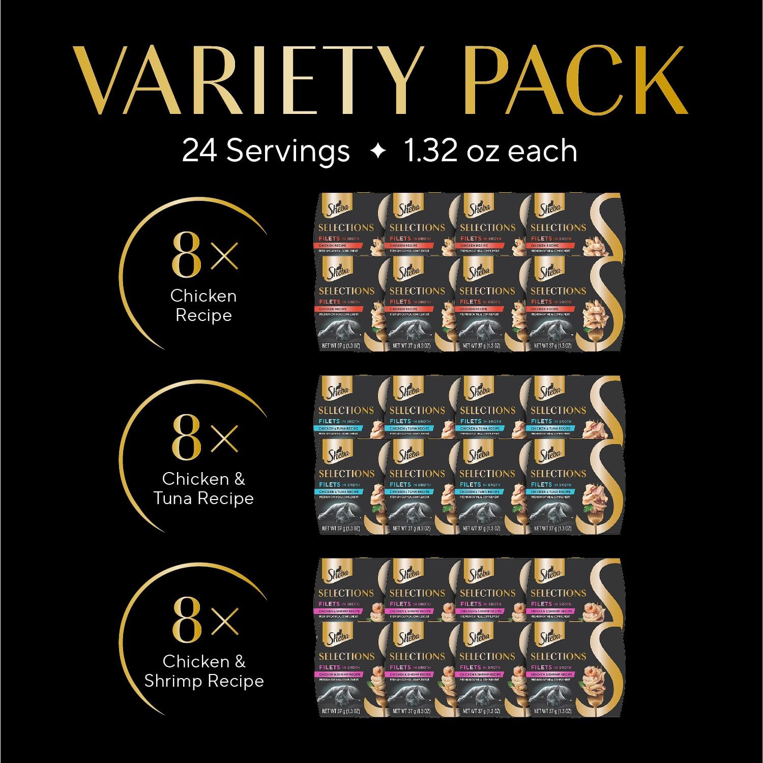 Sheba Selections Filets in Broth Adult Wet Cat Meal Complement Chicken, Tuna, or Shrimp Recipe, 1.3 oz. Cups, 24 Count