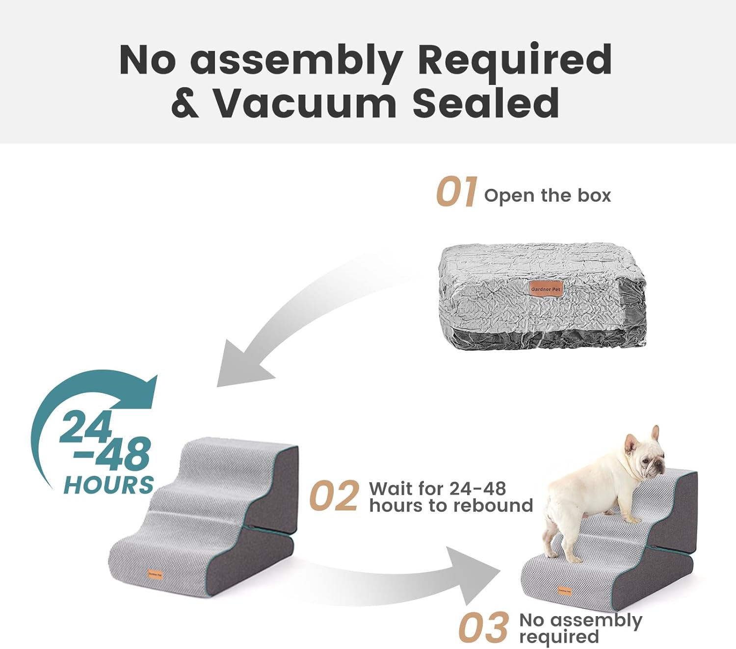 - No Assembly Required: The dog stairs for bed is convenient and hassle-free, simply unbox the pet steps, your furry friend can start using it right away. Due to vacuum compression, the surface of the puppy stairs may appear slightly wrinkled, and it will recover within 24-48 hours.