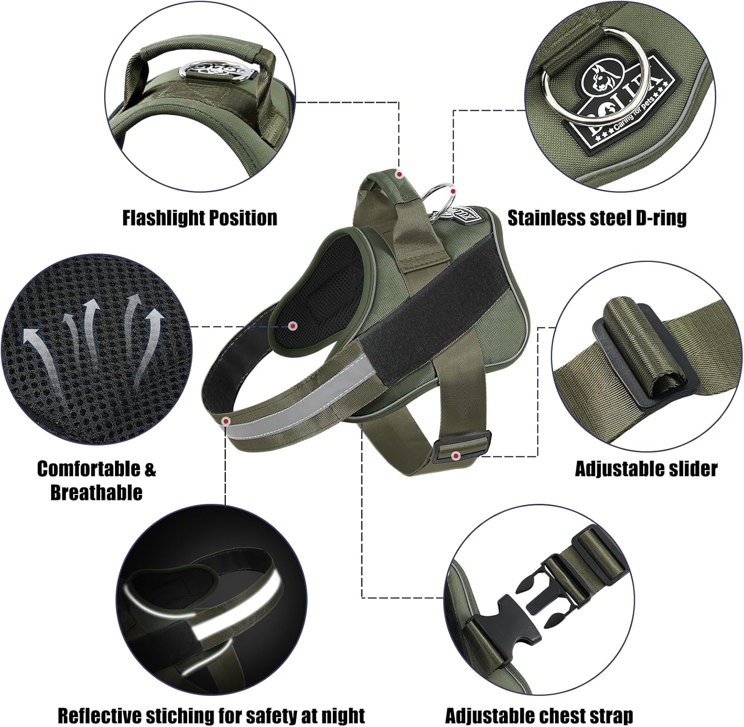 - STURDY HANDLE: The adjustable dog harness with rugged nylon handle further enhances your distance from the dog and is more intimate with each other. Easy on dog harness is also the best partner for dogs and is easy to control your dog.