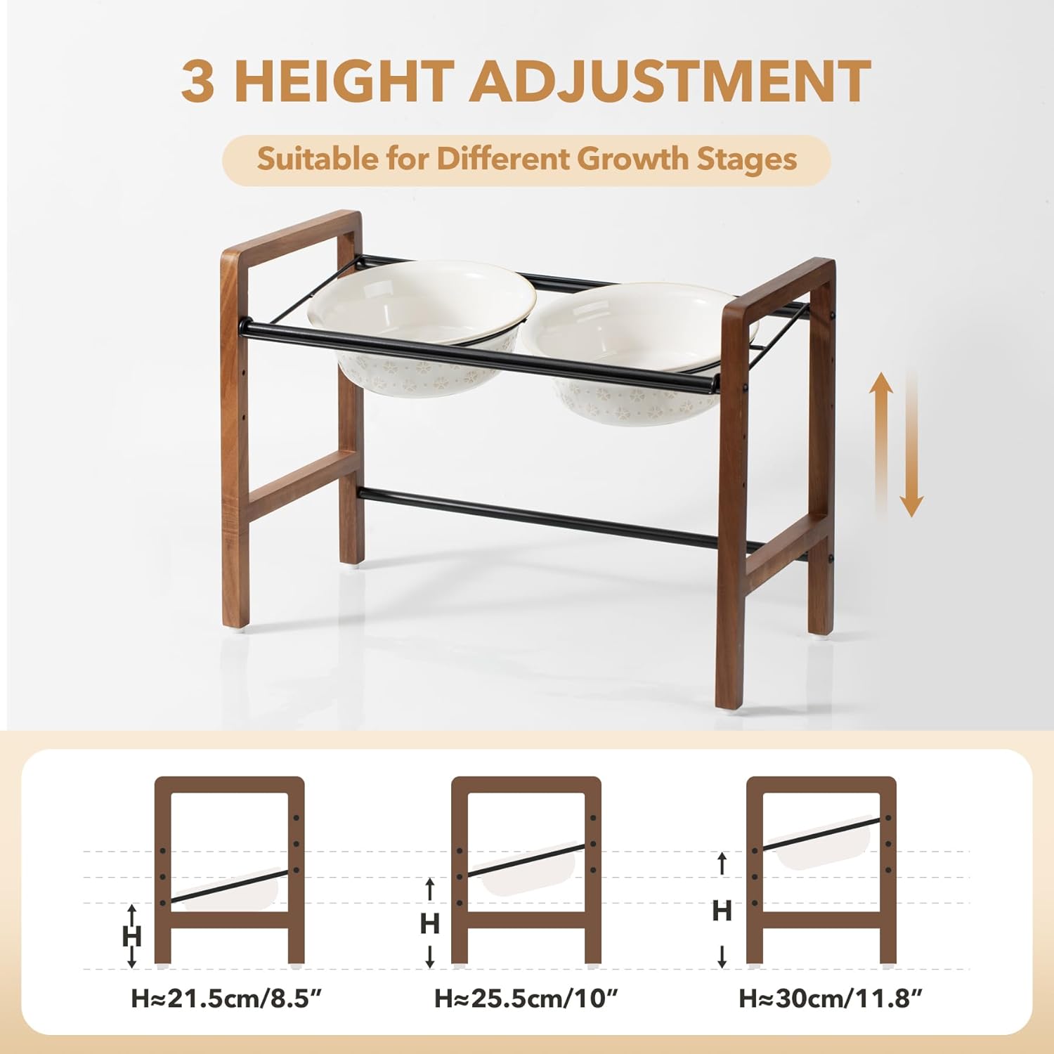 - Acacia Wood and Metal Stand: This stand combines classy acacia wood with metal rods, which is aesthetically pleasing and fits perfectly with any home decor style. Raised ceramic dog bowls provide dogs with correct eating posture, help reduce bloating and neck strain in dogs, and prevent indigestion problems.