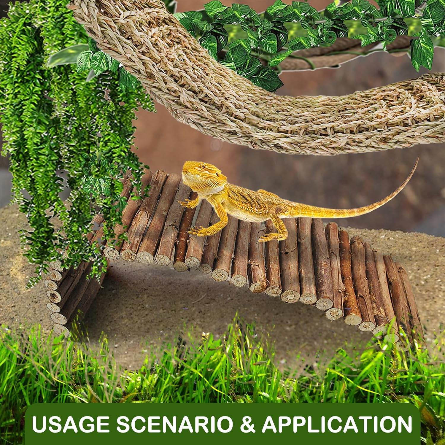 - 【Package Included】Reptile tank accessories include 1 Pcs crested gecko wooden bridge(15.7 x 6.0 inches/40 x 15 cm)、1 Pcs reptile rectangular hammock(15.7 x 6.7 inches/40 x 17 cm)、1 Pcs reptile vine plants (33.46 inches/85cm)、1 Pcs fexible leaves decor(78.74in/200cm) 、1 Pcs flexible rattan decoration(78.74in/200cm)、six clasps and five suction cups.