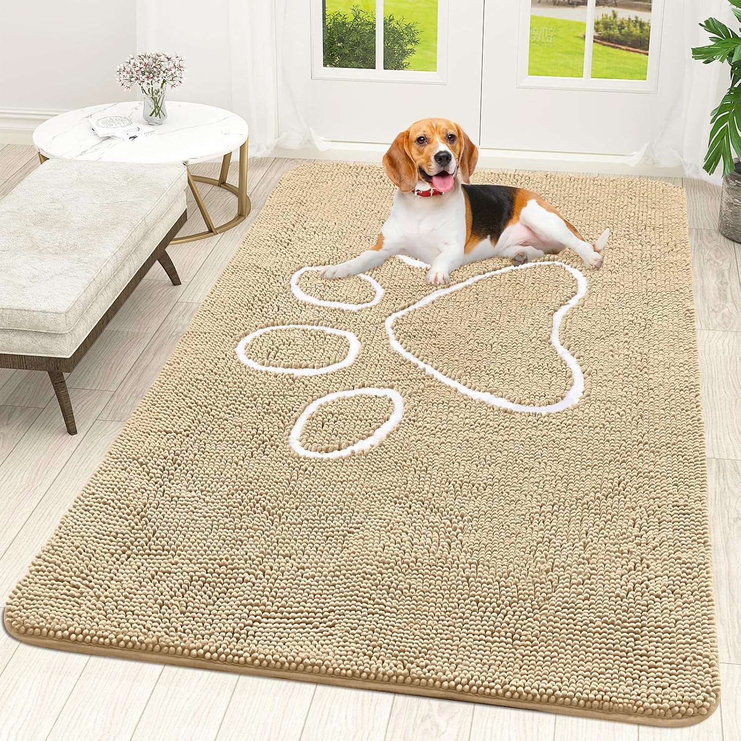 OLANLY Door Mat for Muddy Dog Paws 70x46, Ultra Absorbent Chenille Mud Doormat with Paw Print Design, Non-Slip Washable Doormat for Indoor Entryway, Quick-Dry Pet Bed Mats for Dirty Dogs, Beige