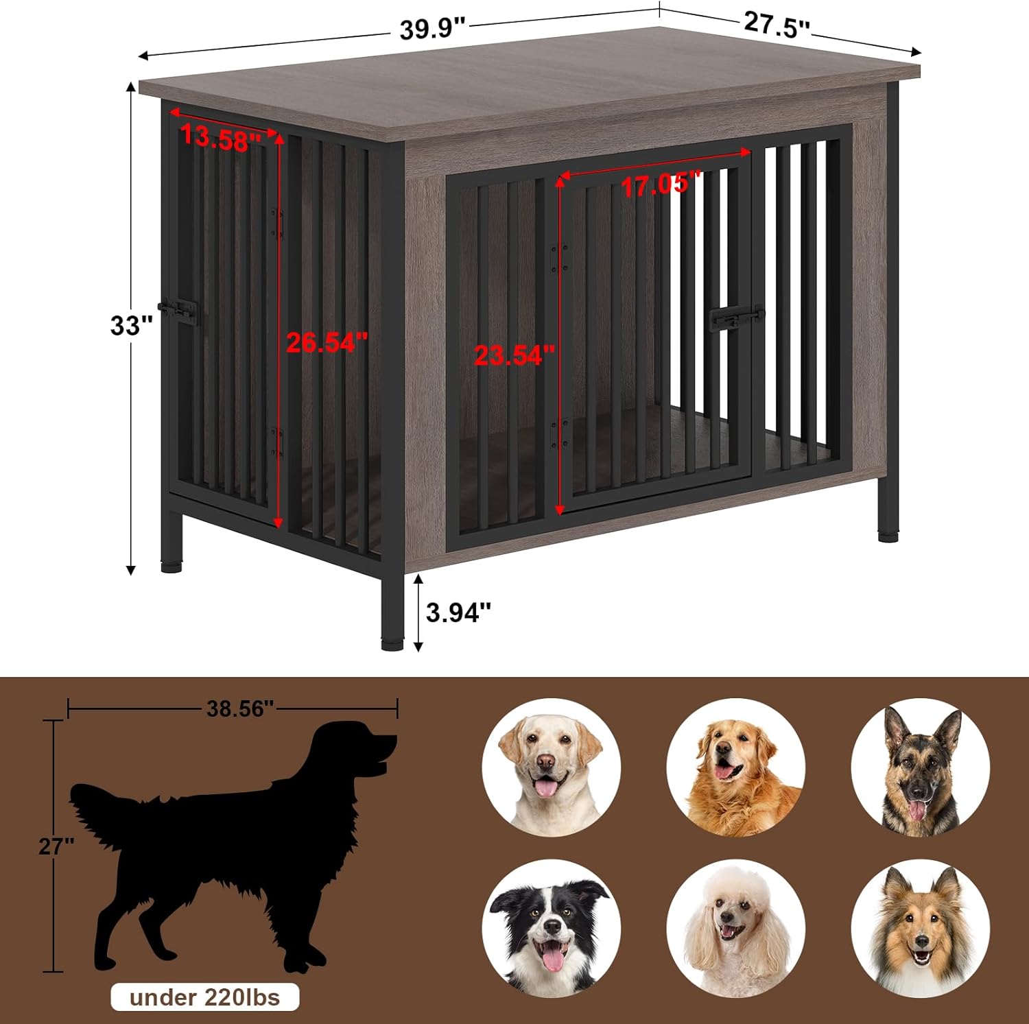 - 【Provide Ample Space for Dogs】: With 39.96" W x 27.56" D x 33.07" H dimension, the dog kennel furniture can allows medium and large dogs to have a comfortable and spacious living space, avoiding anxiety and unease due to limited space. The middle partition can be installed or removed according to your needs, the specific installation steps can refer to the detailed manual.