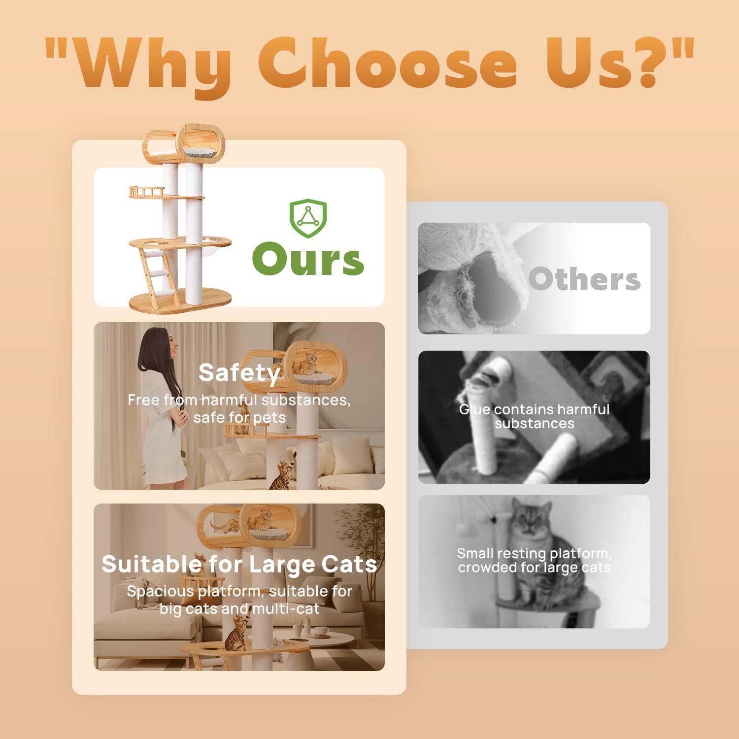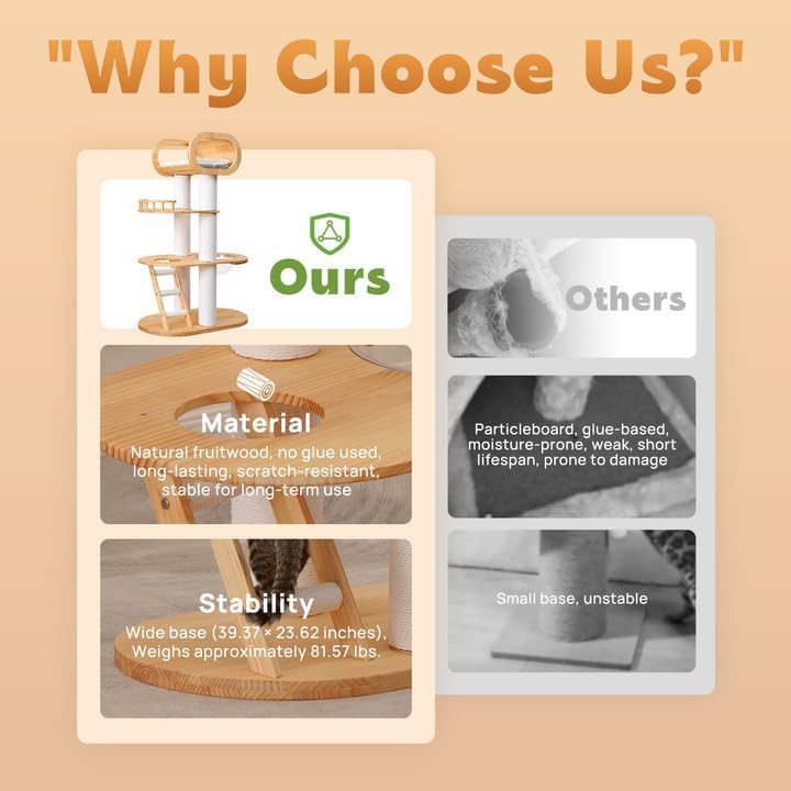 - Natural Materials: KZLAA Luxury cat tree made of natural pine wood and natural sisal, the safe material has no odor and will not cause harm to people and pets. Sturdy solid wood can support multiple cats playing on it.