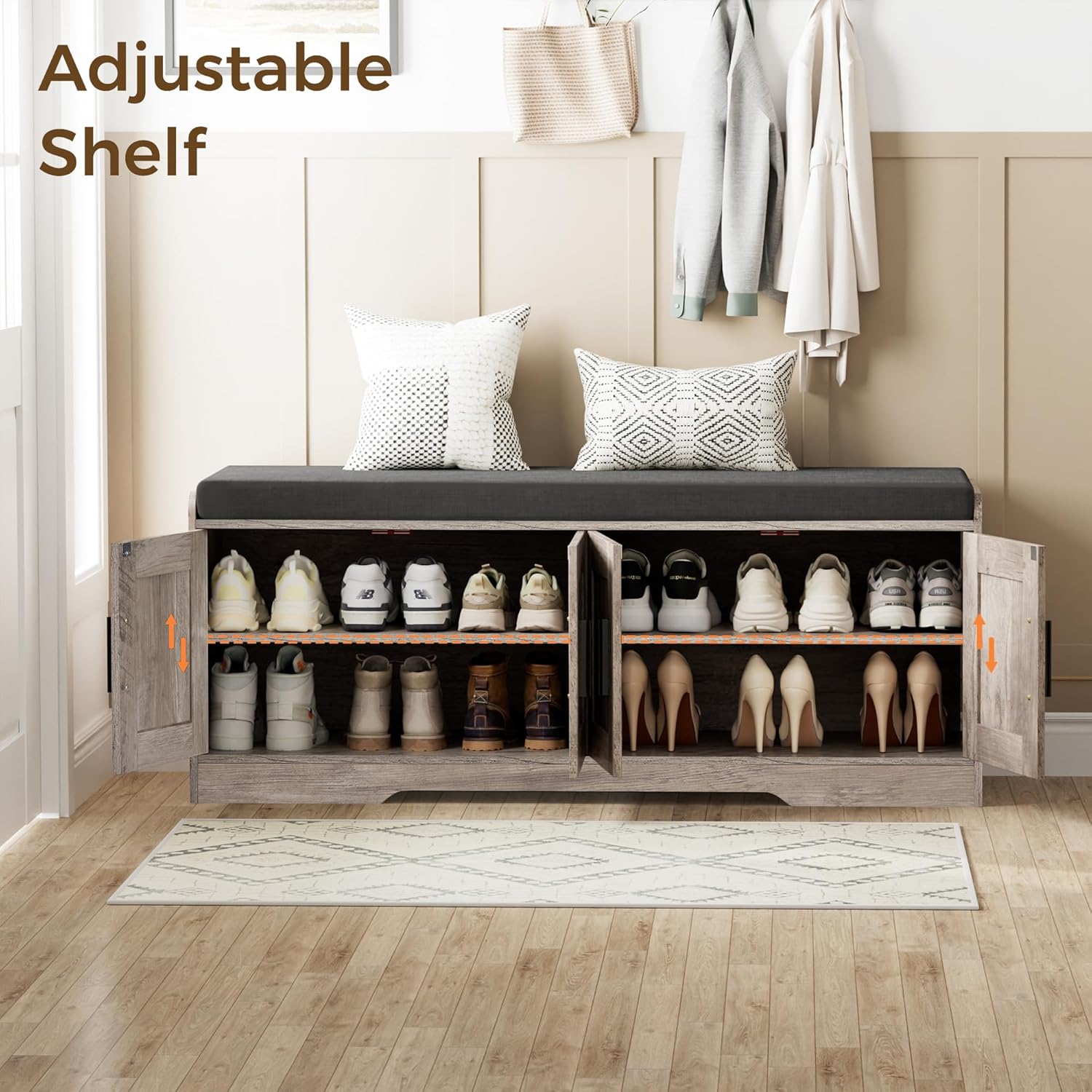 - Keep Your Shoes Organized: The depth of bench is 13.8 inches, which makes it easily to put in your shoes, meanwhile shoes of various heights can be placed by adjusting middle movable boards. The bench doors design ensures not only your privacy, but also a tidy space