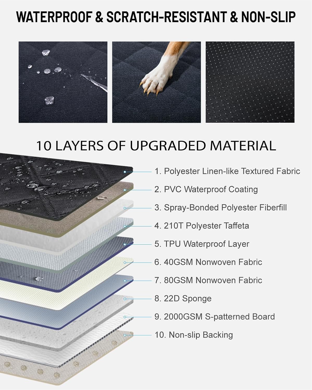 - Waterproof, Scratch-resistant & Non-slip: Constructed with 10-layer materials including PVC coating, TPU and 210T polyester, this dog back seat extender resists spills and wear. The 8mm high-density sponge and S-patterned board ensure stability, while the polyester linen-textured surface provides grip and scratch resistance.