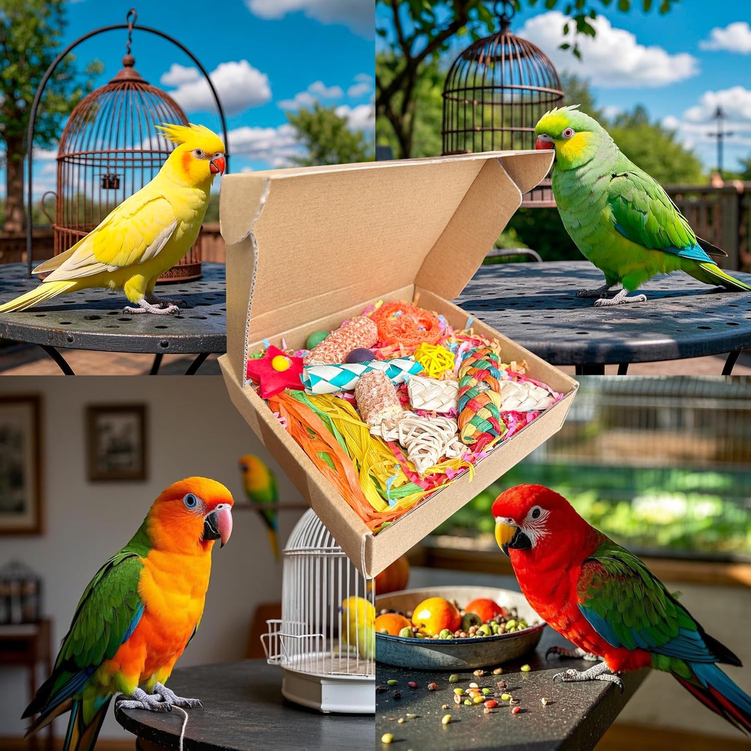 - NATURAL BIRD TOYS EXCLUSIVE DESIGN: Incorporates four natural behavioral layers: Tear Zone: Colorful shredded paper simulates a jungle leaf search. Foraging maze: hidden to stimulate the exploratory instincts Grooming texture: natural fibers promote healthy beak development 3D Climbing Net: 30° angled path that conforms to the bird's structure