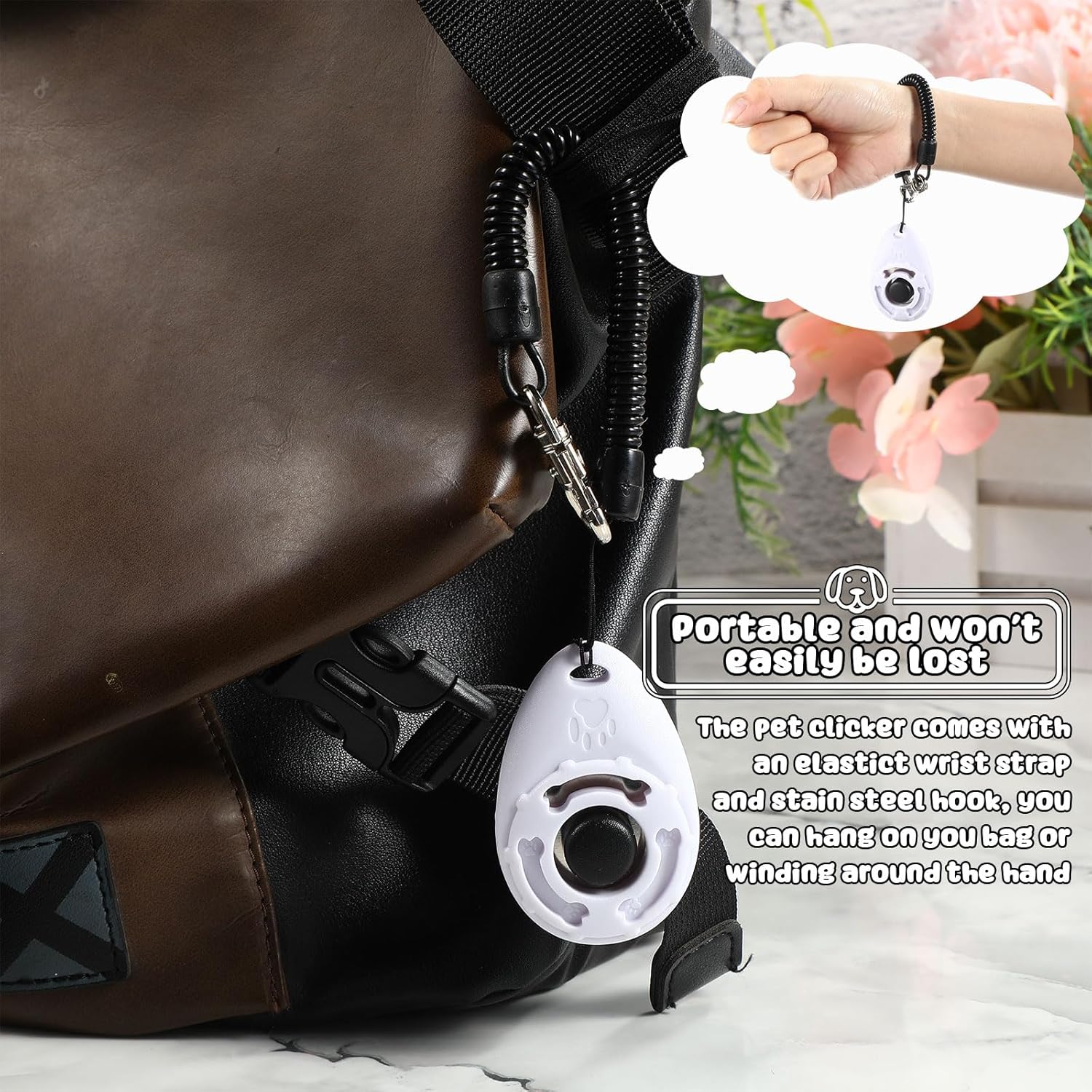 - Easy To Use: The Dog Training Clicker makes it comfortable and secure. It is attached to a keychain ring and elastic bracelet; Wear it on your wrist or hang it up or attach it to your handbag, so you don't drop it and can access easily and quickly; Wrist attachment makes it more comfortable and easier to hold onto, than box clickers when training your pet